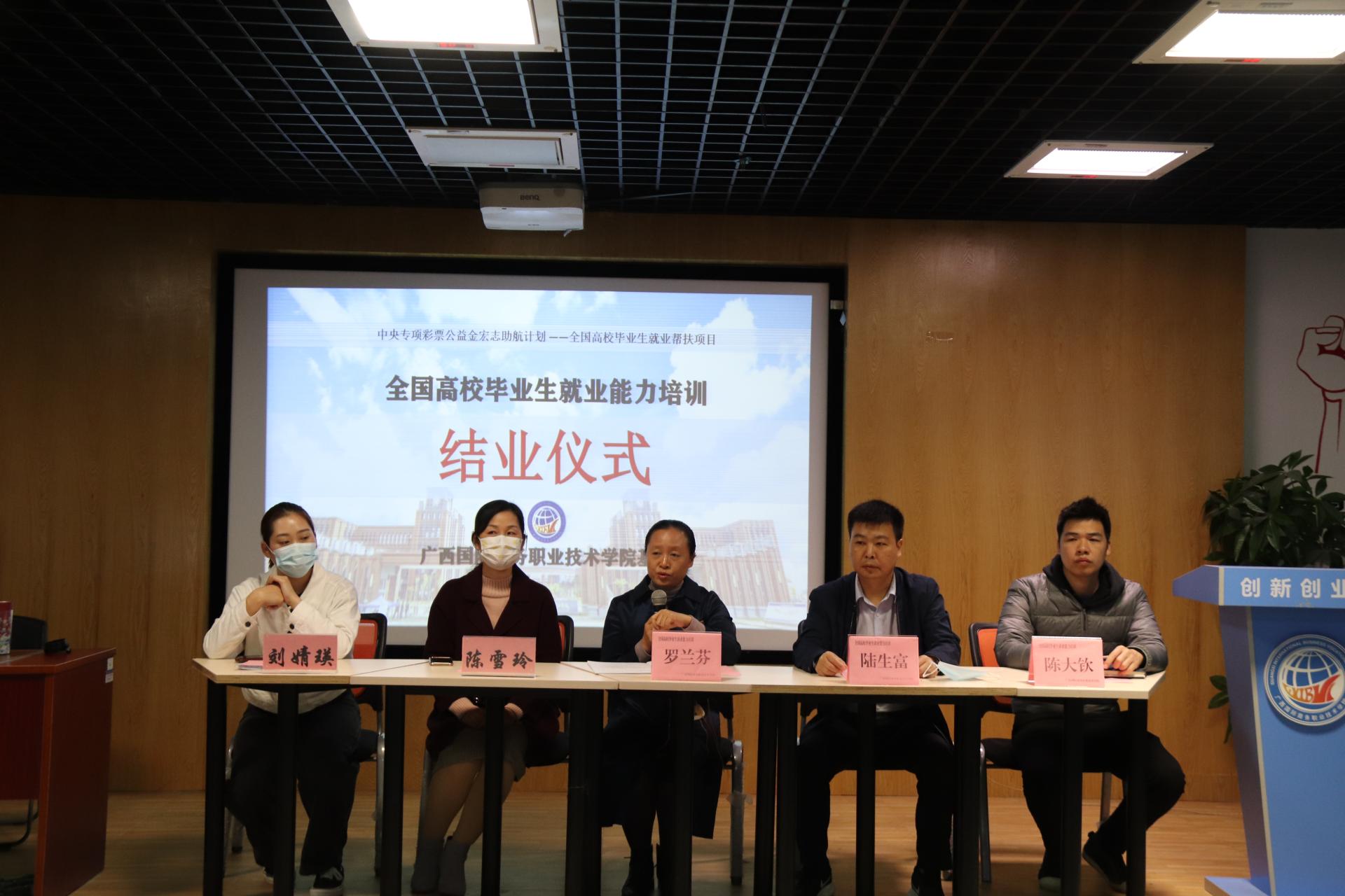 12月8日下午,由教育部主办,我校承办的“宏志助航计划”全国高校毕业生就业能力培训基地第二期培训班在我校图书馆2楼创客空间顺利举行结业仪式。创新创业学院院长罗兰芬、文化与旅游学院党总支专职副书记陈雪玲、创新创业学院教师陈大钦,广西安全工程职业技术学院就业指导科副科长陆生富、招生就业处干事刘婧瑛参加结业仪式。