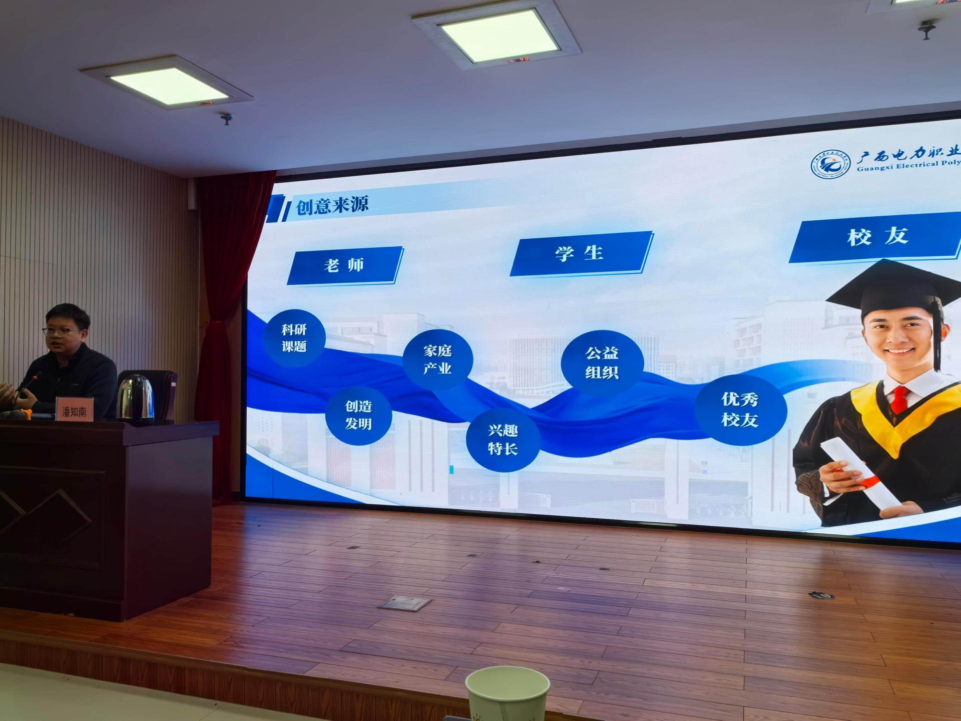 活动特别邀请了广西电力职业技术学院创新创业学院创业指导科科长潘知南副教授作为主讲嘉宾。现场播放了潘知南教授指导学生获得2025年中国国际大学生创新大赛银奖的创业项目视频,让与会师生直观感受到了创新创业的魅力与成果。在主题分享环节,潘知南教授围绕高职生发明创新的路径与方法、发明专利申请与成果转化案例、创业项目孵化与资源整合策略等三个模块内容进行了深入浅出的讲解。他通过生动的案例和实用的建议,为师生们提供了宝贵的发明创新与创业指导。互动问答环节更是将现场气氛推向高潮,师生们积极提问,潘老师耐心解答,共同探讨了发明与创业过程中的种种困惑。