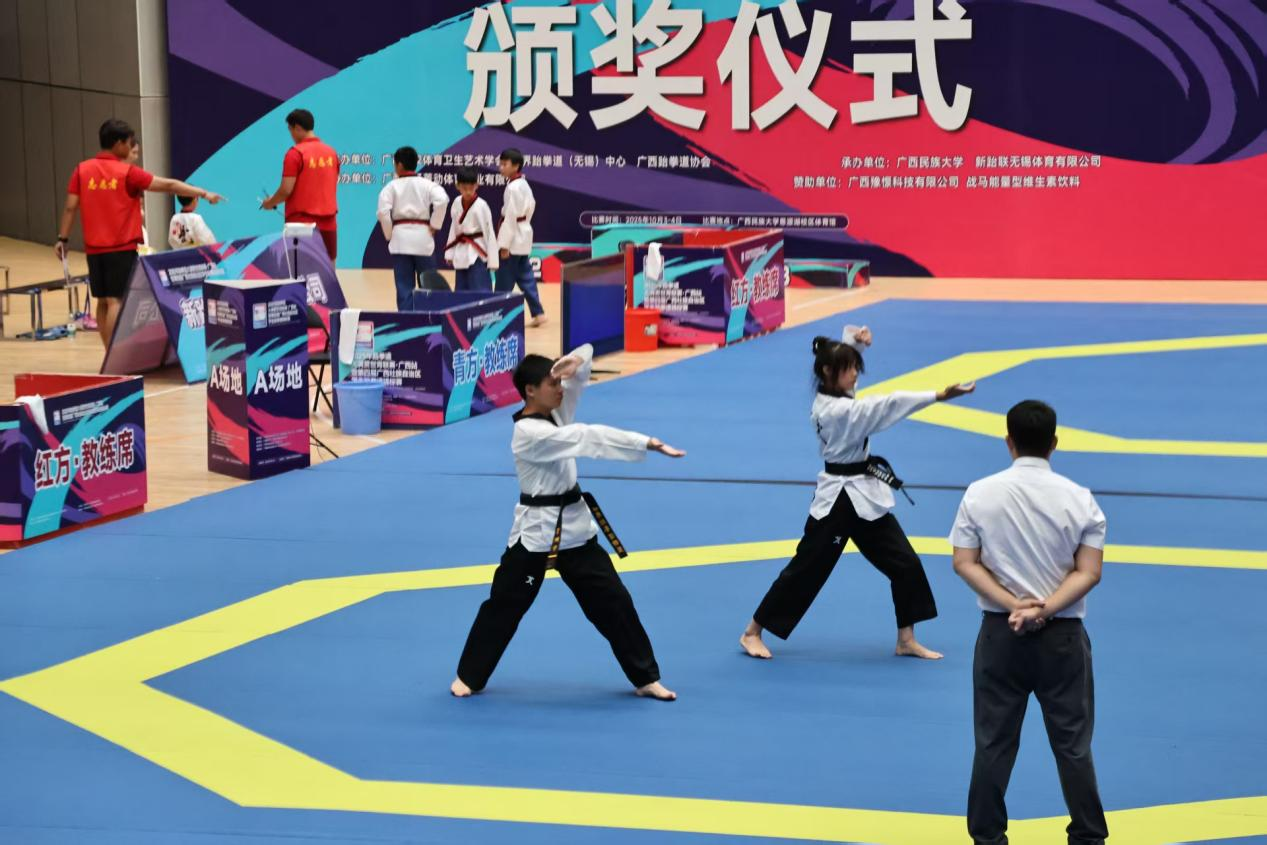 2025年10月3日至4日,由广西体育卫生艺术学会、世界跆拳道(无锡)中心及广西跆拳道协会联合主办,广西民族大学承办的“2025年跆拳道大满贯世青联赛(广西站)暨第四届广西壮族自治区学生跆拳道锦标赛”圆满落幕。我校跆拳道代表队在比赛中发挥出色,共夺得四金、五银、两铜的优异成绩,并分别荣获高校乙组品势项目团体总分第一名与个人竞技项目团体总分第一名。