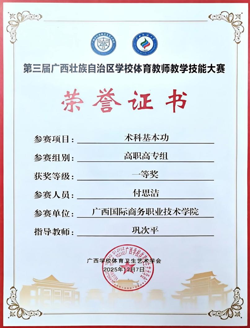 12月7日,由广西学校体育卫生艺术学会主办的第三届广西学校体育教师教学技能大赛在广西民族大学圆满落幕。我院体育教研室付思洁、梁莉两位老师凭借扎实的专业功底、出色的教学设计与稳定的现场发挥,在激烈角逐中脱颖而出,最终共斩获一等奖1项、二等奖3项、三等奖2项,充分展现了我院体育教师出色的综合素养与教学水平。
