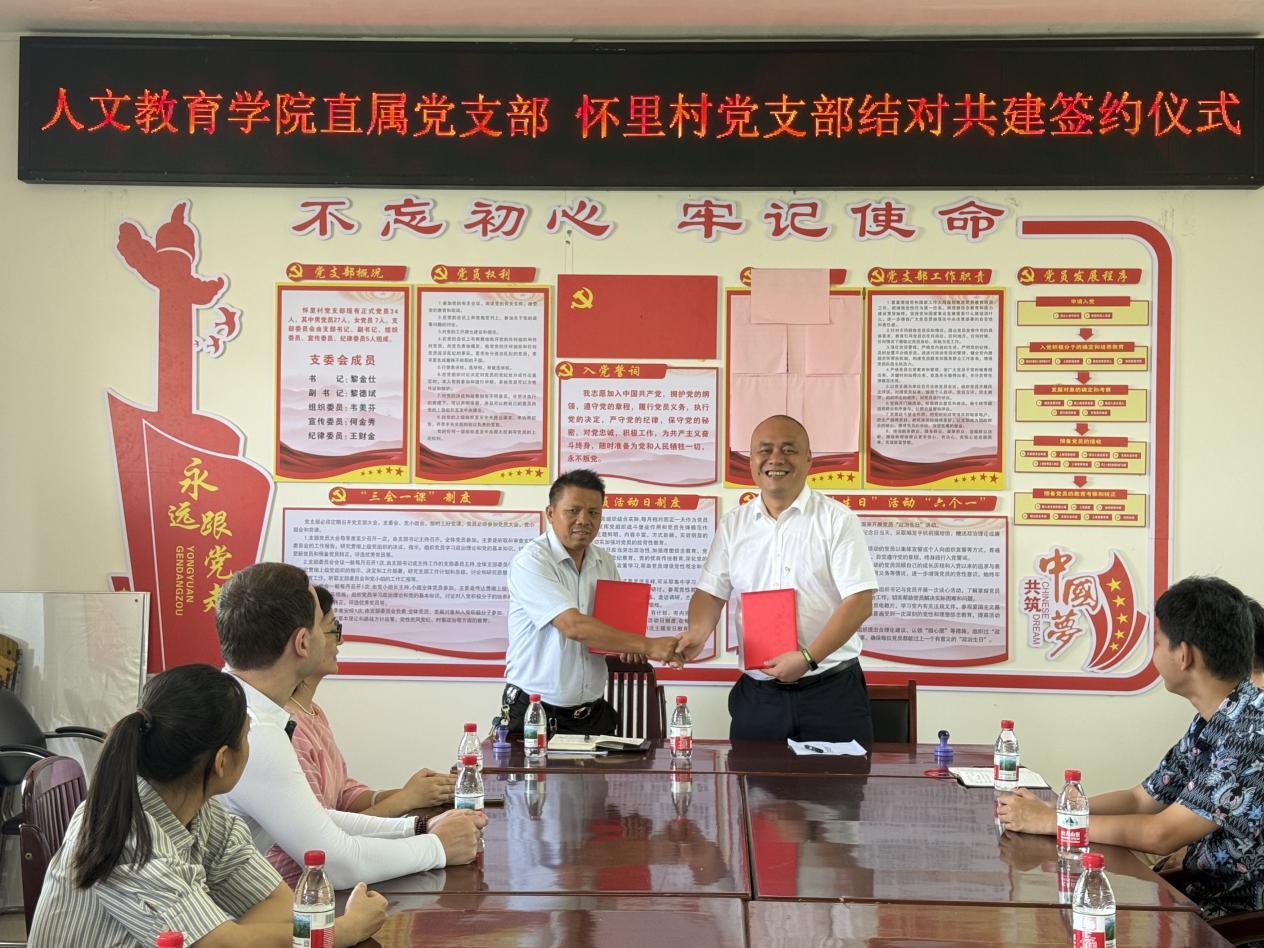 人文教育学院直属党支部分别与南丹县里湖瑶族乡纪后村、怀里村、瑶里村党支部签订结对共建协议,正式建立结对共建关系。双方围绕如何充分发挥各自优势、共享资源,共同打造集党建活动、乡村振兴与人才培训等功能于一体的活动阵地进行了深入交流。以此为契机,双方希望未来形成“共建共赢、信息互动、工作联动”的合作机制,构建稳定、持续、高效的结对共建体系。