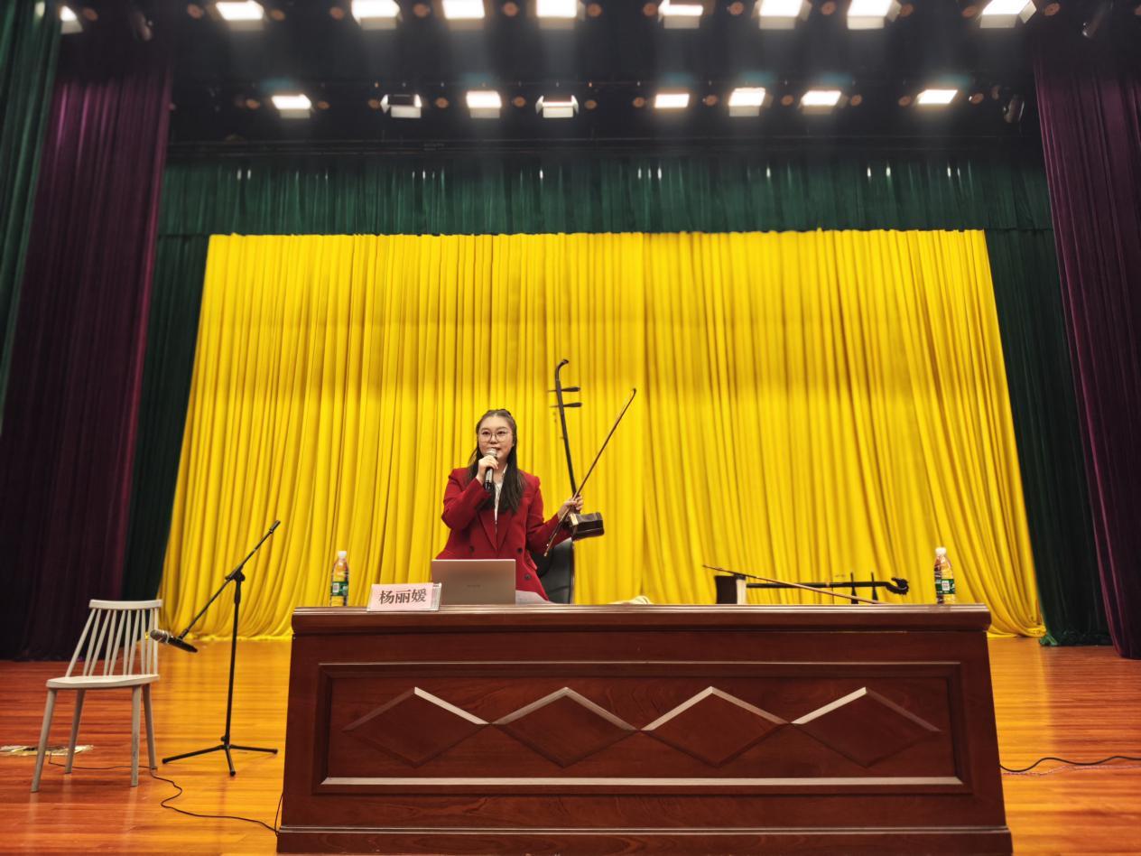 讲座以二胡艺术为切入点,深入探讨了中国传统音乐美学在当代文化语境中的传承与创新。主讲人通过理论阐释、名曲赏析与现场演示相结合的方式,生动展现了胡琴家族的丰富形态与文化内涵。杨丽媛老师以《弓弦上的中国:十二胡琴的瑰丽世界》为脉络,从二胡的经典韵味出发,逐步引领听众领略了板胡的北方豪情、高胡的南国灵秀、马头琴的草原史诗等各具地域特色的胡琴艺术。她指出,胡琴不仅是乐器,更是“中国人情感与精神的弦上写照”,其音色中蕴含着不同地域的文化基因与生命律动。