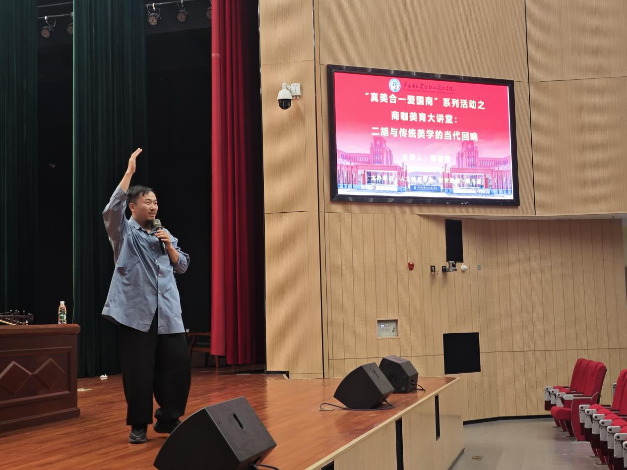 11月14日下午,由人文教育学院牵头主办的“真美合一爱国商”系列活动之商咖美育大讲堂在东盟校区聚学堂成功举行。本次讲座以“二胡与传统美学的当代回响”为主题,特邀知名音乐家百里耽、杨丽媛联袂主讲,吸引了近千名师生参与,现场气氛热烈,座无虚席。