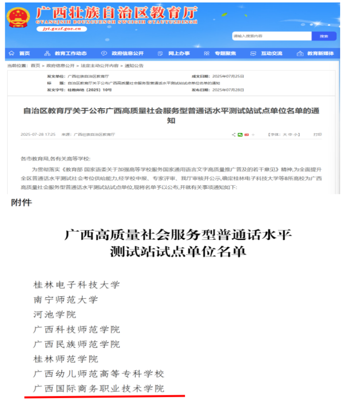 近日,广西壮族自治区教育厅正式发布《自治区教育厅关于公布广西高质量社会服务型普通话水平测试站试点单位名单的通知》(桂教师培〔2025〕10号),我校成功入选8所试点高校名单,这标志着我校在推动国家通用语言文字普及、服务社会方面取得新的成绩,为学校进一步发挥语言文字工作优势奠定坚实基础。