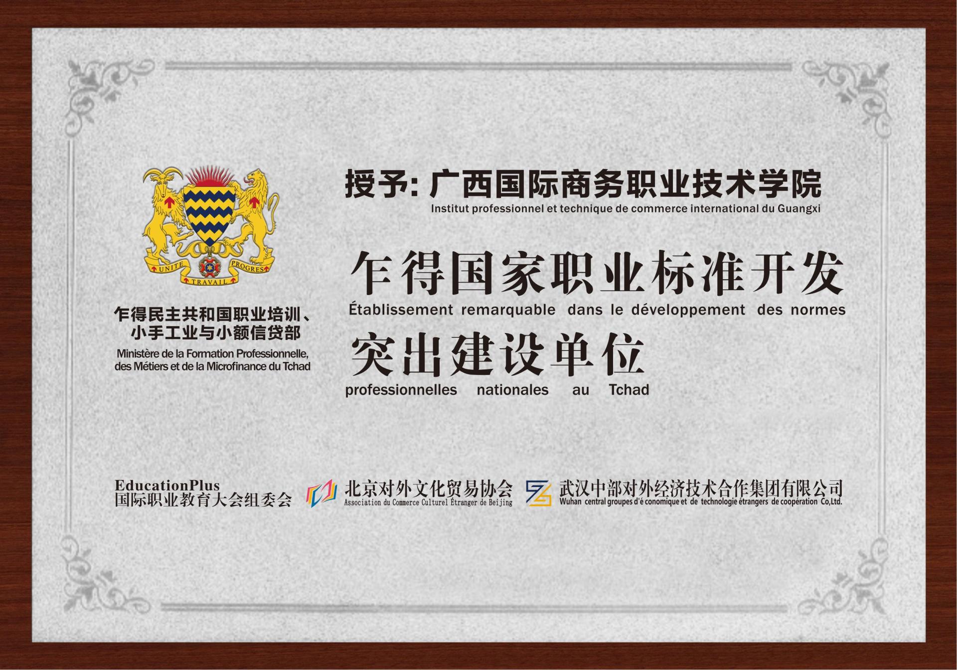 由我校独立开发的“连锁企业门店店长5级”职业标准及专业教学标准文件已完成编写并获得认证证书,即将纳入乍得国民教育体系并进行推广应用。学校获得乍得职业培训、小手工业与小额信贷部授予的“乍得国家职业标准开发突出建设单位”荣誉。