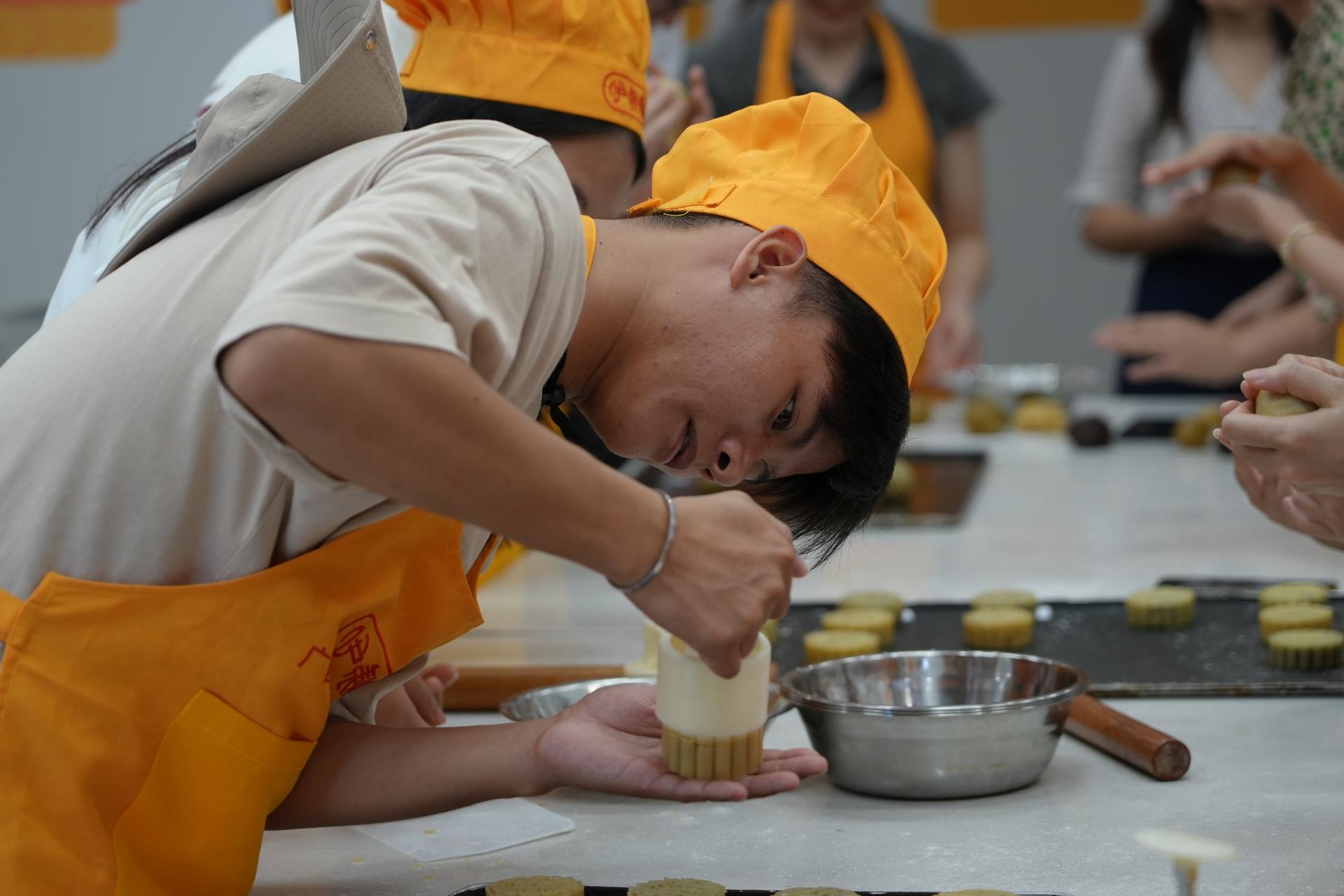 活动伊始,南宁市一职校的校长助理周健老师向大家介绍了中秋节的由来与习俗,让外籍师生对这个充满诗意的节日有了更深的了解。随后,面点老师现场演示了月饼的制作过程,从和面、包馅、压模到烘烤,每一步都详细讲解,确保每位参与者都能掌握技巧。