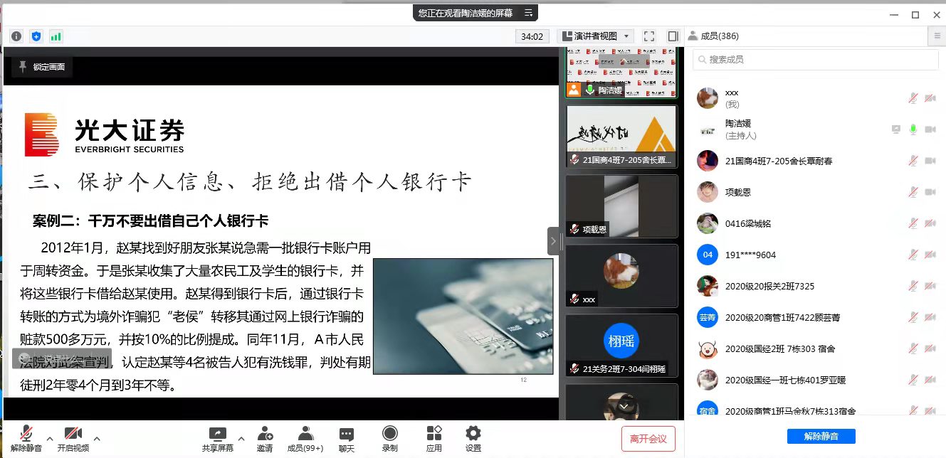 为了提高大学生识别和防范电信诈骗的能力,增强个人信息保护意识,科学使用国家反诈中心APP,使防范电信网络诈骗知识入耳、入脑、入心,进一步筑牢学校防范电信网络诈骗的坚固屏障,国际贸易学院联合光大银行在3月15日晚共同举办了防范电信网络诈骗专题讲座,学院19、20、21级全体学生参与。