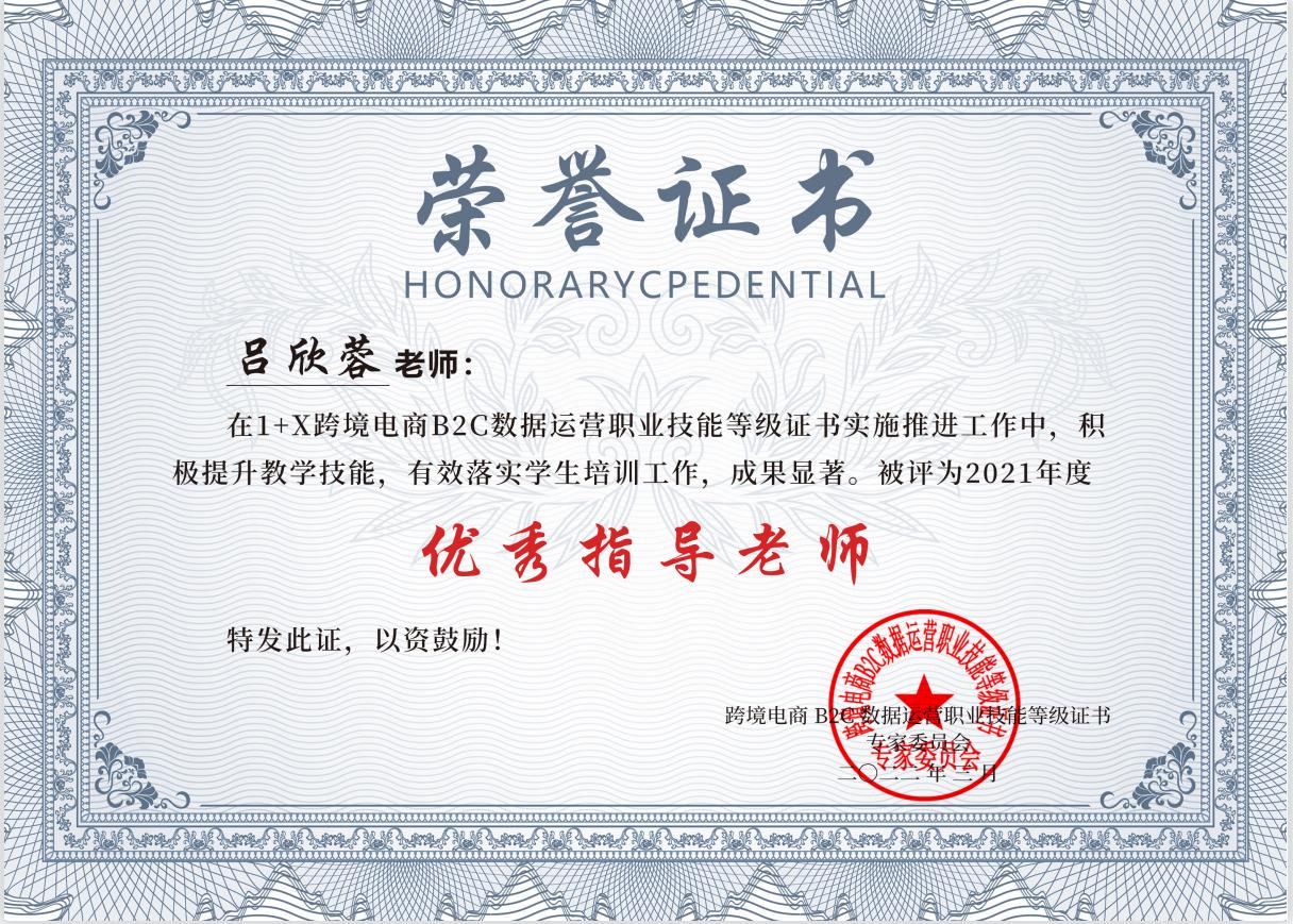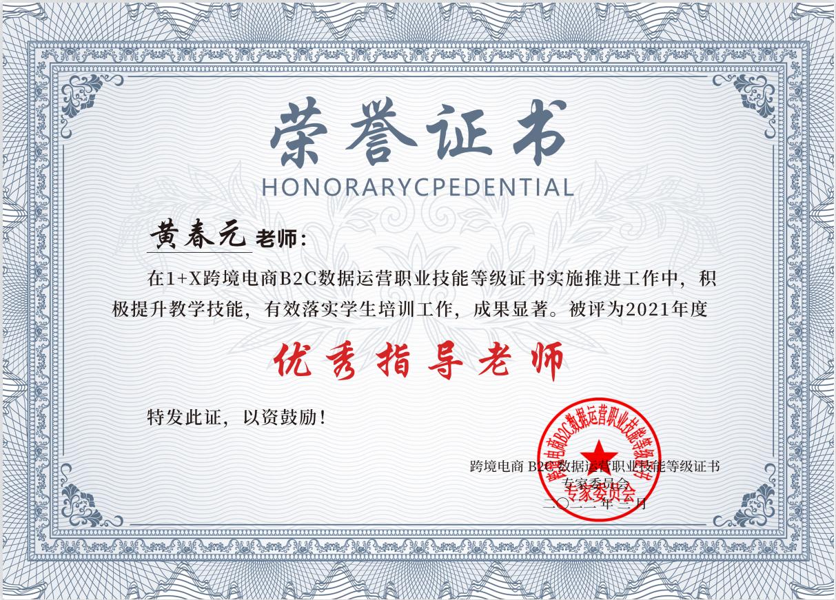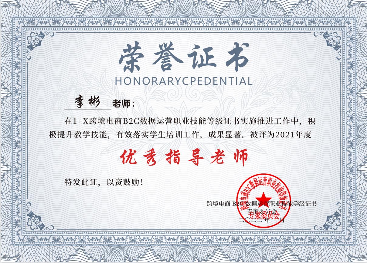 近日,1+X跨境电商B2C数据运营职业技能等级证书培训评价机构公布了该项证书2021年度优秀考核名单,我校2021年12月首次组织学生参加跨境电商B2C数据运营职业技能等级证书(中级)考试,通过率达99%,圆满完成培训与考核任务,被评为“优秀试点院校”。冯畅、黄莹、黄春元、海艳、李彬、吕欣蓉六位老师被评为“优秀指导老师”。