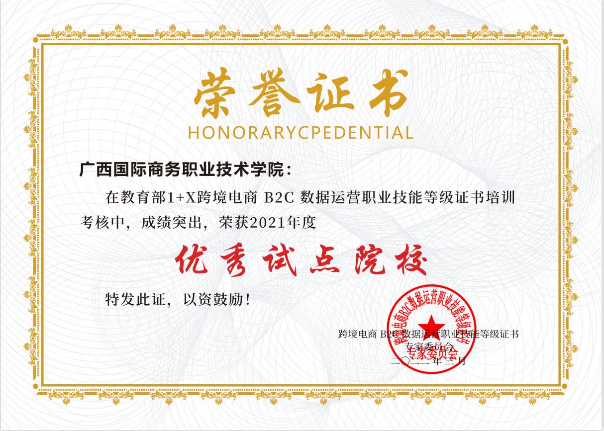 跨境电商B2C数据运营职业技能等级证书是国家推行的第四批次认证“1+X”职业技能等级证书,我校在2021年取得该证书试点单位资格,并获得广西教育厅批准为牵头院校。为提升相关专业学生的技能水平,扩宽学生就业面,学院高度重视培训及考证工作,组建了培训教师团队,对学生进行细致的考前培训和辅导,保障了此次考证任务的圆满完成。此次被评为“优秀试点院校”,对我院各专业进一步深化产教融合,推进“岗课赛证”教育教学模式改革,奠定了坚实的基础和保障。