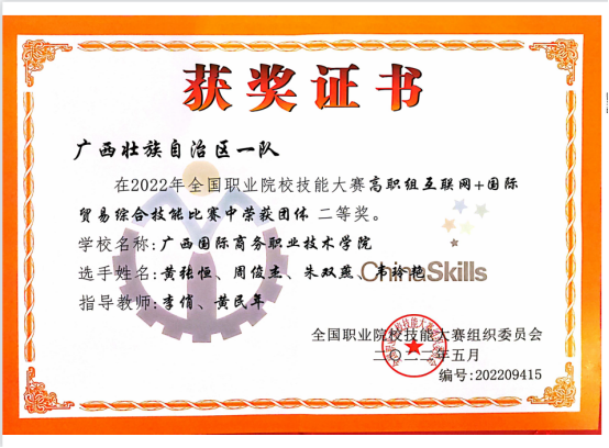 8月23日至8月24日,2022年全国职业院校技能大赛(高职组)“互联网+国际贸易综合技能”赛项在陕西工业职业技术学院举行。国际贸易学院黄张恒、周俊杰、朱双燕、韦玲艳四位同学在李俏、黄民年老师的指导下代表广西壮族自治区参赛,从全国29个省、市、自治区的56支代表队中脱颖而出,斩获该赛项团体二等奖。