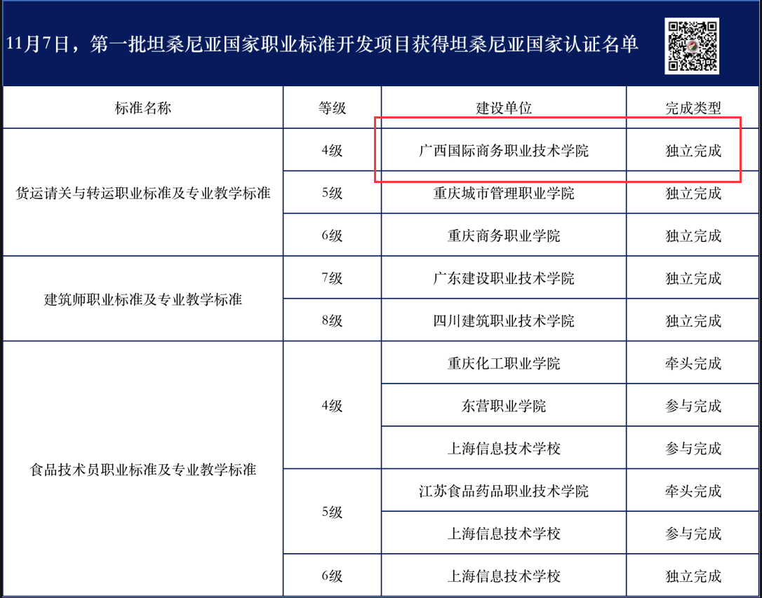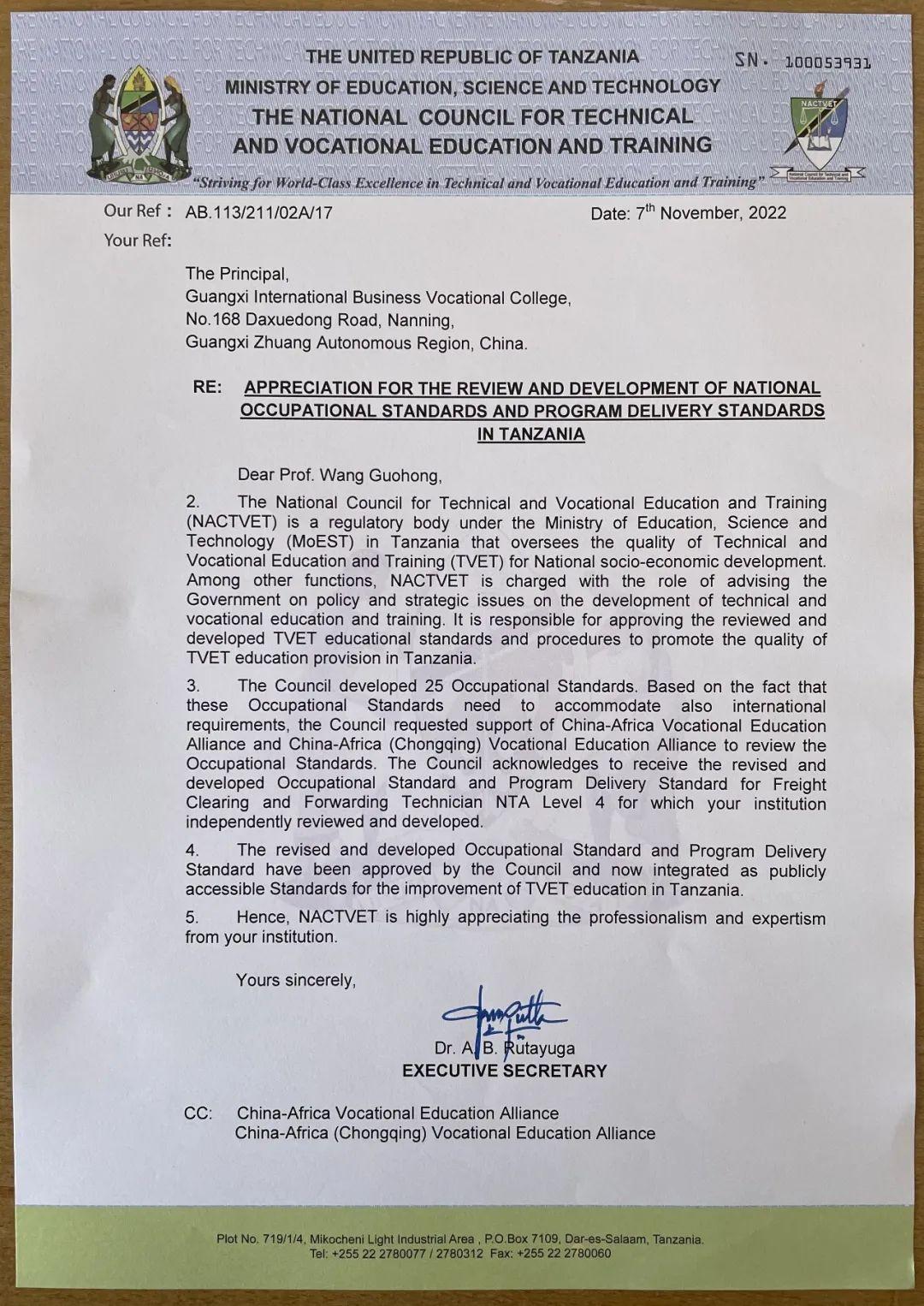 2022年11月7日,我校独立完成的货运清关与转运职业标准及专业教学标准通过了坦桑尼亚国家职业教育委员会审核,获得坦桑尼亚国家认证,正式纳入坦桑尼亚国家职业教育体系!