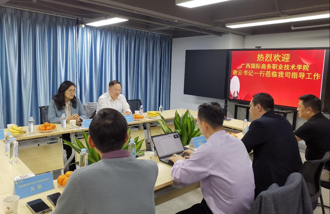 在广州骏奕信息科技有限公司,谢云书记一行参观了腾讯智慧校园应用场景,并与公司负责人进行深入交流。谢云书记介绍了学校发展历程、办学定位及毕业生基本情况,在新职教法实施之后,对产教融合、校企合作提出了新的要求,希望校企间多走动、常沟通,加强交流合作,探索更多新思路新模式。粤港澳跨境电商产教融合联盟秘书长吴航介绍了广东地区跨境电商产教融合的情况及产业学院建设方案,为我校产教融合工作提供了经验借鉴。