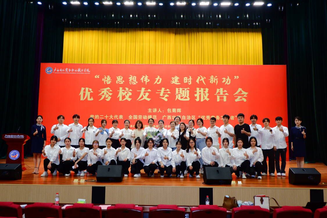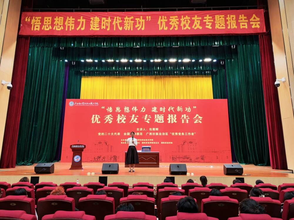为深入学习贯彻党的二十大精神和习近平总书记关于职业教育的重要指示批示精神,深入开展学习贯彻习近平新时代中国特色社会主义思想主题教育,进一步发挥校友的先锋模范带头作用,更好地促进学生的全面发展,5月17日下午,党的二十大代表包菊辉专题报告会在我校东盟校区召开。党的二十大代表、全国劳动模范、广西壮族自治区“优秀党务工作者”、我校校友包菊辉以《扎根基层担使命 为民服务践初心》为主题做了一场生动的宣讲报告,同时也为广大师生带来了一堂精彩的青春思政课。本次报告会作为学校职教活动周项目之一,由教务科研处、国际贸易学院党总支承办。学校东盟校区各二级学院师生代表到场参会。