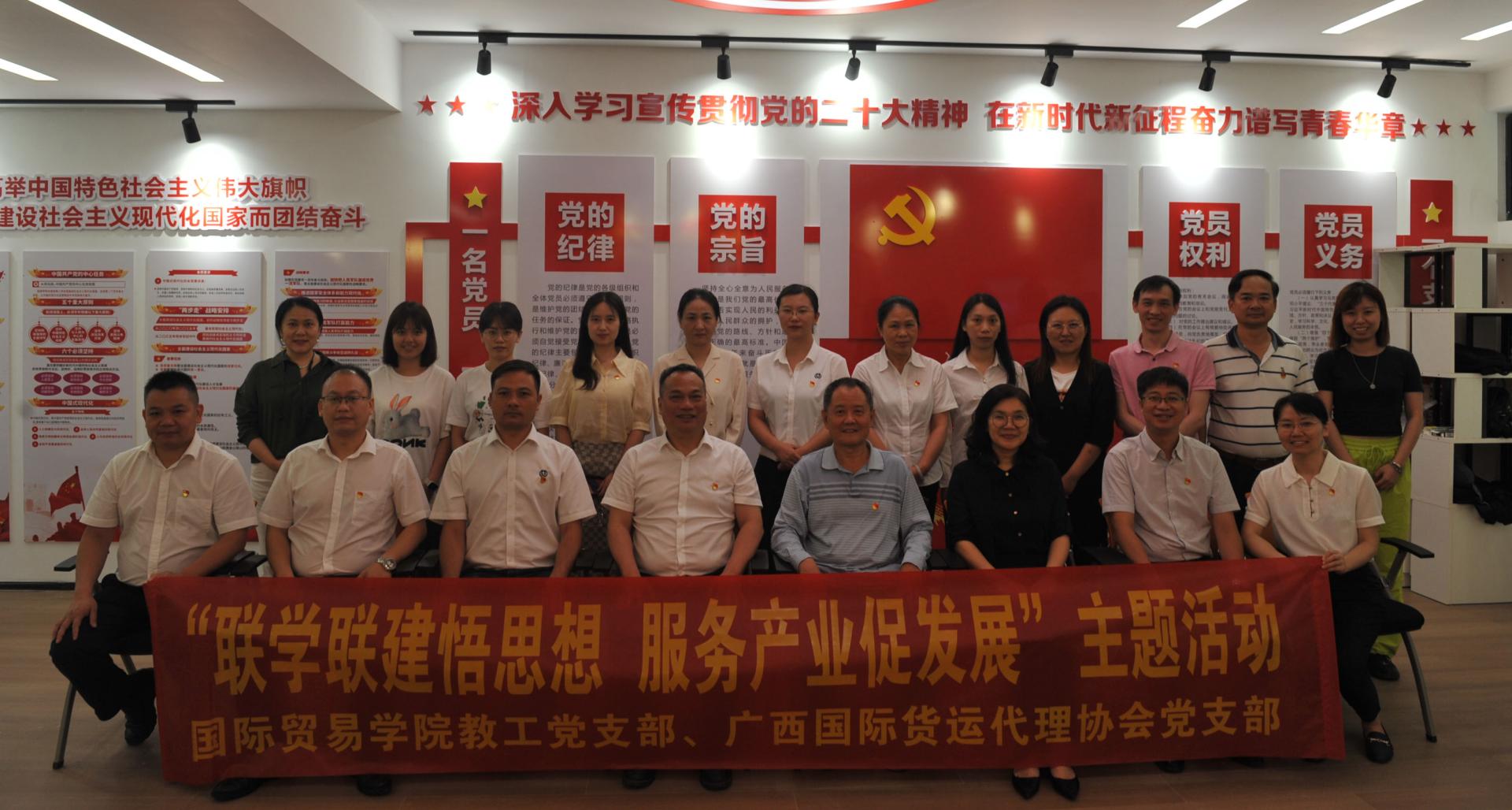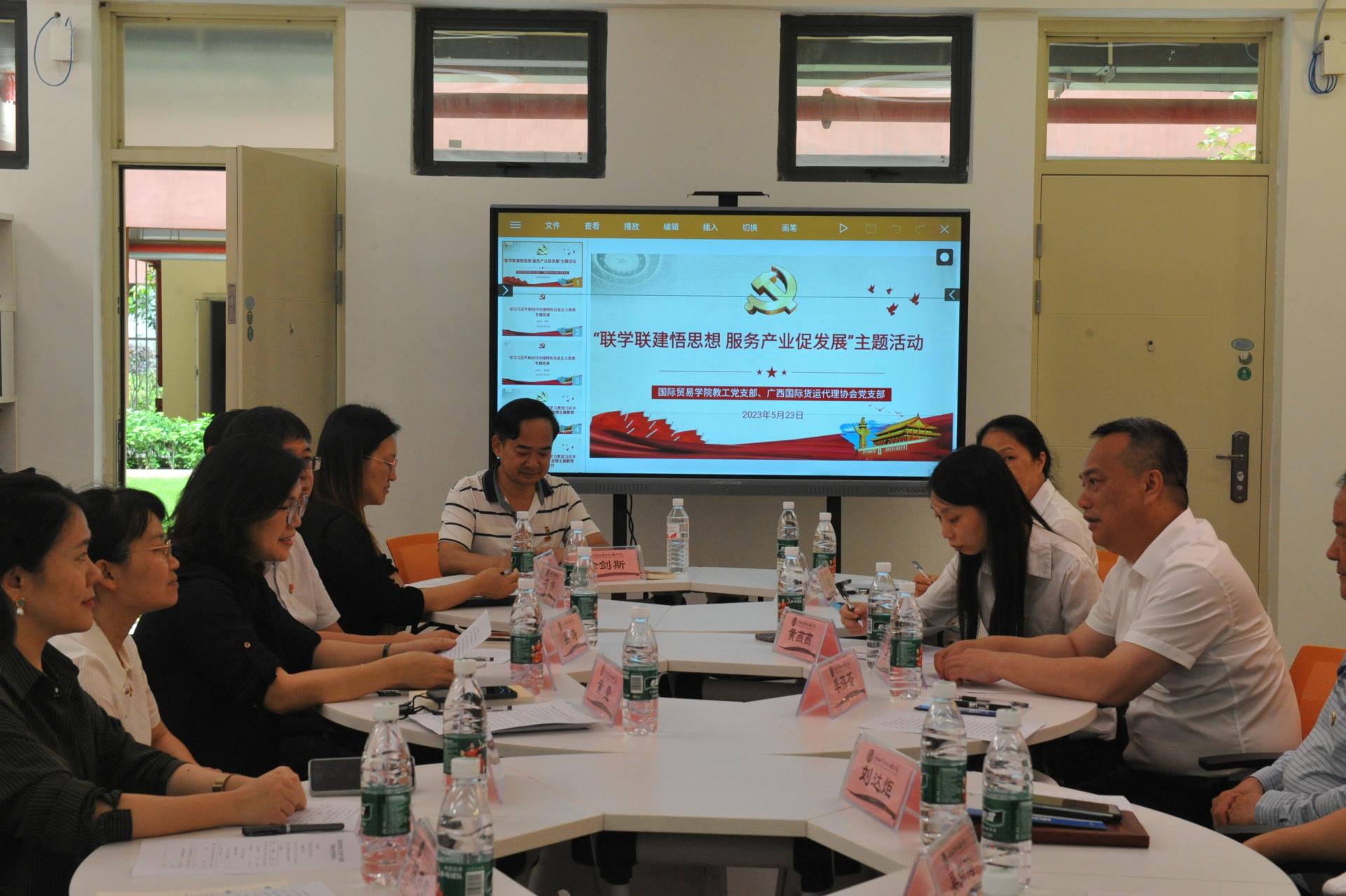 为了深入开展学习贯彻习近平新时代中国特色社会主义思想主题教育,切实推动党建与业务深度融合见行见效,构建“资源共享、互相促进、共同提高”的校行企党建工作新格局。5月23日下午,广西国际货物运输代理协会党支部书记吴日明率领支部党员及协会骨干企业党支部的党员到我校东盟校区,与国际贸易学院教工党支部开展主题教育党建联学活动。国际贸易学院院长邓海涛参加活动。