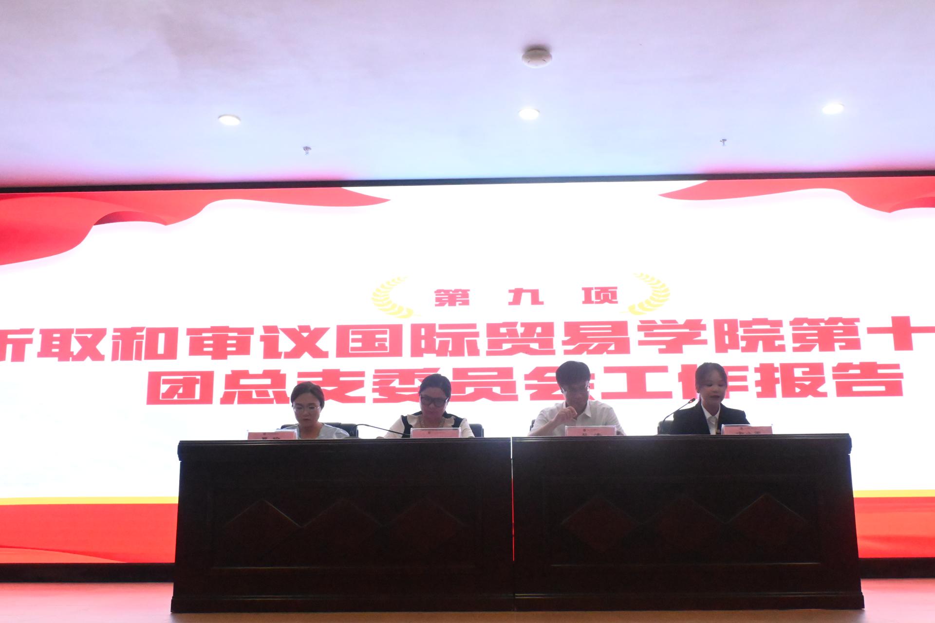 2023年6月16日上午,国际贸易学院团总支第十三届第一次委员增补大会在东盟校区师生活动中心三楼报告厅召开。在中国共青团第十九次全国代表大会召开前夕举行本次大会,对我院全体团员及青年学子而言意义非凡。大会审议通过了国际贸易学院第十三届委员会工作报告,选举产生了国际贸易学院团总支第十三届第一次委员增补委员。校团委副书记吴柳蓉、国际贸易学院副院长吴涛、国际贸易学院团总支负责人覃俭出席本次会议,学院辅导员以及各班团员代表参加会议。