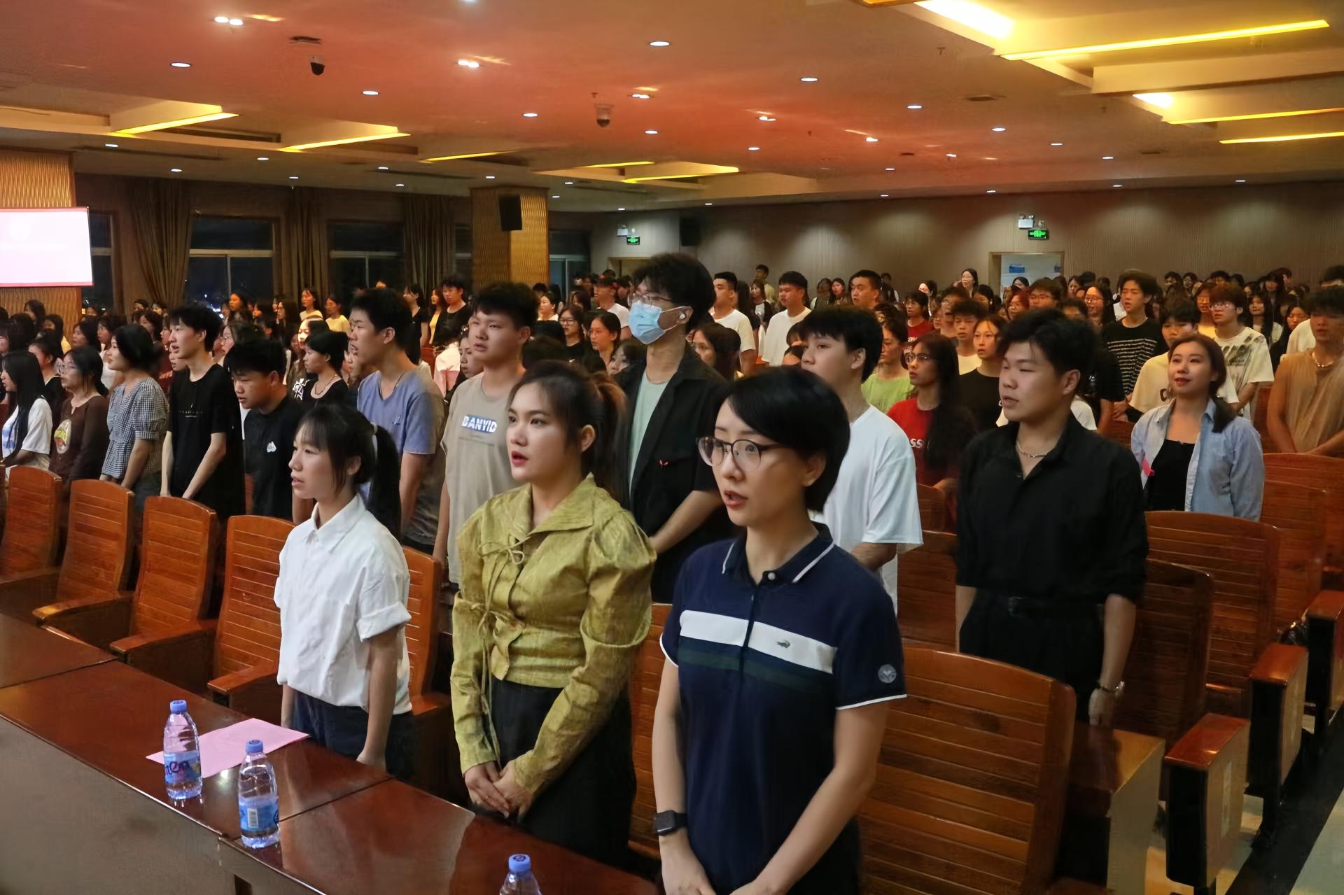 典礼伊始,新生们整齐地带上院徽,起立奏唱国歌,洪亮的歌声拉开了开学典礼的序幕。在新生开学第一课上,学院党总支书记邓菲以“理想信念”为主题,向全体新生作入党启发教育。她通过讲述党的百年奋斗历史,结合外交青年叶爽的经历,勉励全体新生要从百年党史中汲取精神力量,传承红色基因。要牢记习近平总书记的教诲,补足精神之钙,从理想信念中找到奋斗目标、收获前进动力、提高精神境界。鼓励新生们要在心中种下理想信念的种子,多参加学院党建品牌“红色微剧场”话剧排演等活动,积极向党组织靠拢,早日成为党组织中的一员。