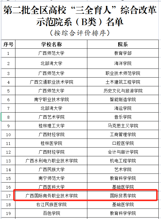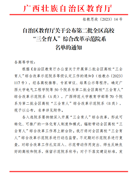 近日,自治区教育厅公布了第二批全区高校“三全育人”综合改革示范院系遴选结果,我院入选全区高校“三全育人”综合改革示范院系(B类)。