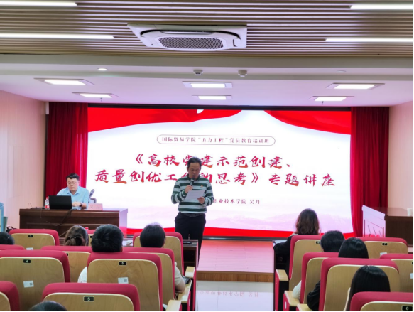为深入学习贯彻习近平新时代中国特色社会主义思想和习近平总书记关于加强高校党建工作的重要论述,进一步做好新时代广西高校党建工作标杆院系培育创建工作,10月19日下午,国际贸易学院在大学路校区图书馆8楼报告厅成功举办《高校党建示范创建、质量创优工作的思考》专题讲座。国际贸易学院全体党员教师,学校其他各党总支、直属党支部党员代表参加本次讲座。讲座由国际贸易学院党总支专职副书记杨明主持。