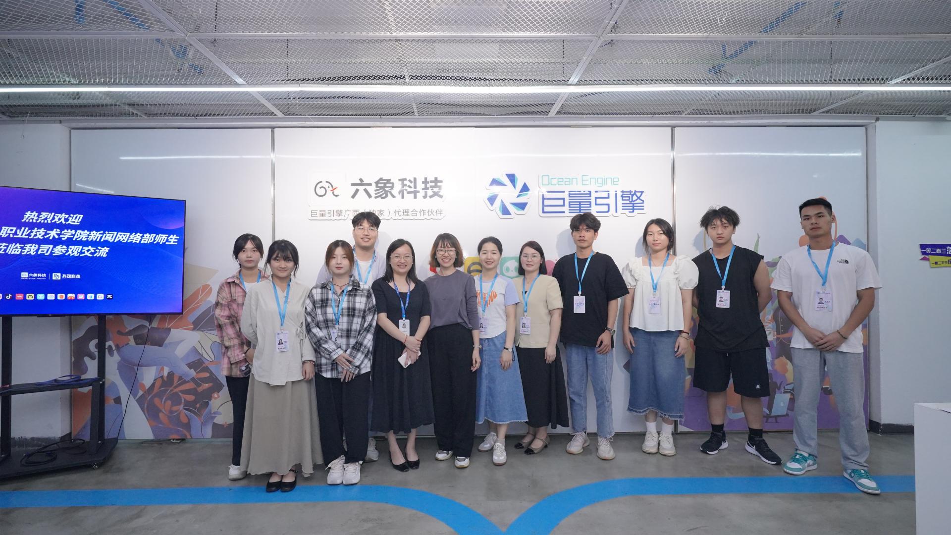 为贯彻落实习近平总书记对宣传思想文化工作作出的重要指示精神,进一步提高国际贸易学院宣传工作质量,树立良好的公众形象,营造良好的舆论氛围,增强凝聚力、竞争力和影响力。11月10日上午,国际贸易学院党总支书记邓菲带领团总支新闻网络部指导老师及学生干部前往广西抖动信息科技有限公司、广西六象信息科技有限公司进行交流学习。