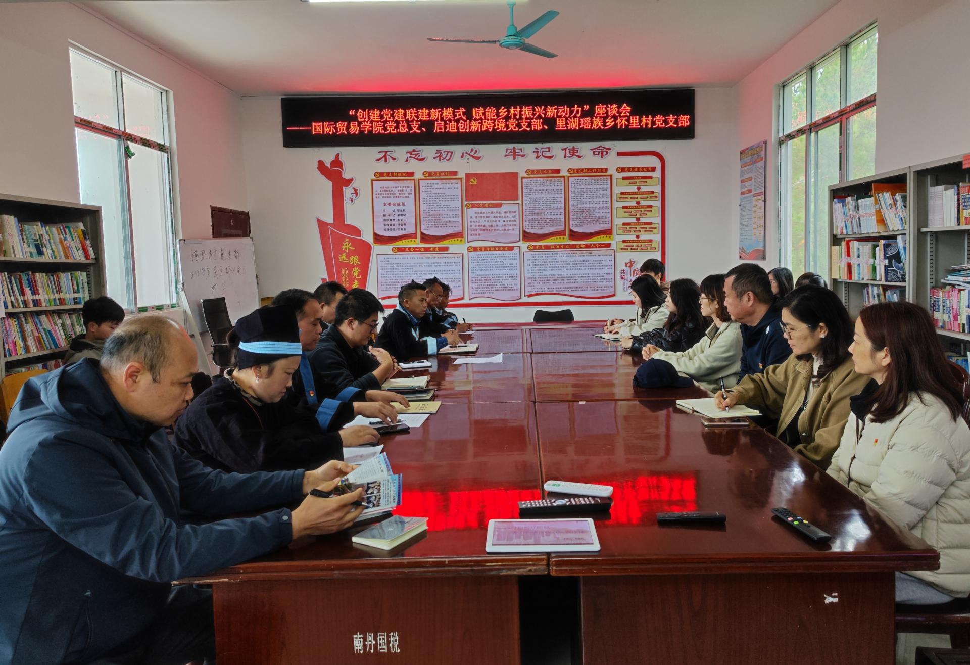 随后,学院党总支、启迪创新跨境党支部与怀里村党支部共同召开“创建党建联建新模式 赋能乡村振兴新动力”座谈会,探索校、企、村联建共谋发展新模式,助推村集体经济发展,村级产业联农带农模式再升级,里湖瑶族乡人大主席韦勇出席会议。会上村支书黎金仕介绍了怀里乡的基本情况,驻村第一书记王建国汇报了驻村以来的工作情况及成效,农村创业青年、南丹白裤瑶阿魅手工刺绣农民专业合作社社长黎国英介绍了合作社目前的发展情况以及存在的困难等。与会人员结合国贸学院和企业的专业特色及产业优势,畅所欲言,积极出谋划策,解决农民专业合作社发展中存在的运营、渠道等实际问题,助推校企合作、产教融合成效。国际贸易学院通过党建共建搭建交流学习的互动平台,充分发挥高校的人才资源优势,将高校的智力、技术和项目资源辐射带动农村地区,助力乡村振兴,切实从方法和路径上为校地党建共建助力乡村振兴提供实践借鉴。会后,学院电子商务专业教师谭小燕针对合作社目前存在的困难和需求,开展电子商务技能培训和创业指导,促进产教融合,数商兴农。