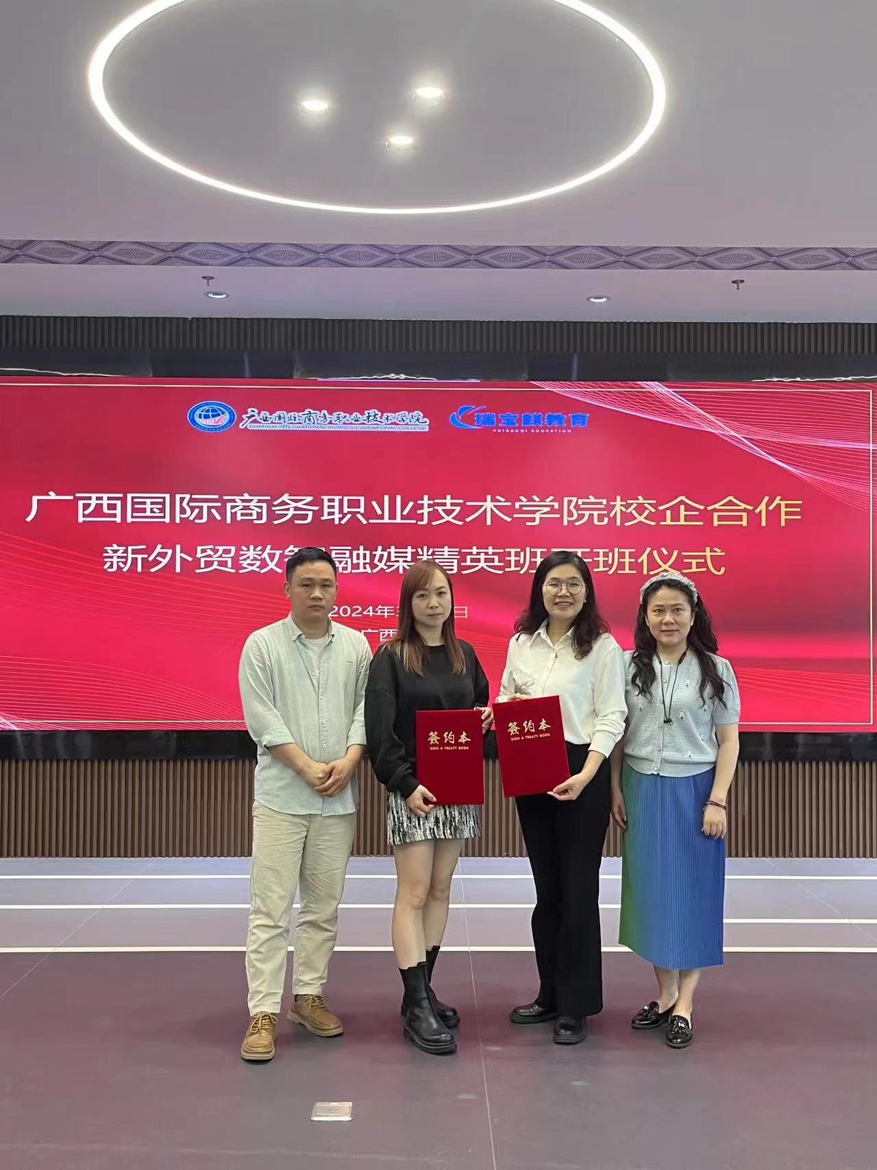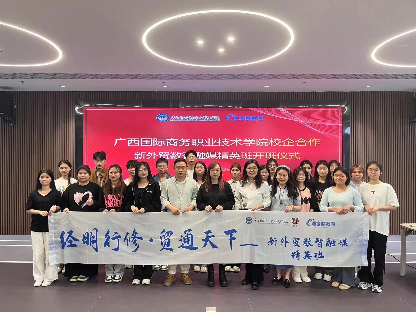为进一步加强校行企合作,推动新外贸职业教育与岗位需求的衔接,为在校学生提供学习实践和发展的机会, 2024年3月23日上午,广西国际商务职业技术学院国际贸易学院与广西瑞宝麒教育科技有限公司合作开办的首届新外贸数智融媒精英班正式开班并举办了开班仪式。国际贸易学院院长邓海涛、精英班学业导师李向敏、广西瑞宝麒教育科技有限公司总经理吴微、精英班企业导师彭浩等出席。仪式由李向敏主持。