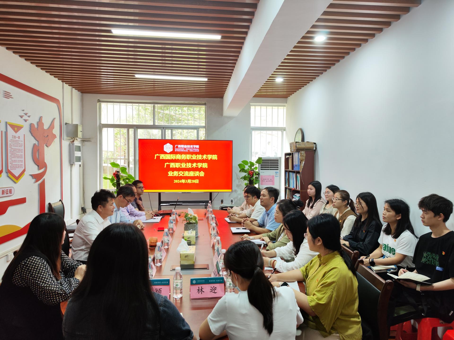 为进一步提升学院学生管理工作水平,强化“丝路逐梦”辅导员工作室建设,推动学院“一站式”学生社区建设,3月28日下午,国际贸易学院党总支专职副书记杨明、学院专职辅导员等一行15人,赴广西职业技术学院调研学习。广西职业技术学院学生工作部部长周新韶、学工部副部长、校团委书记姜卓茂出席座谈会。