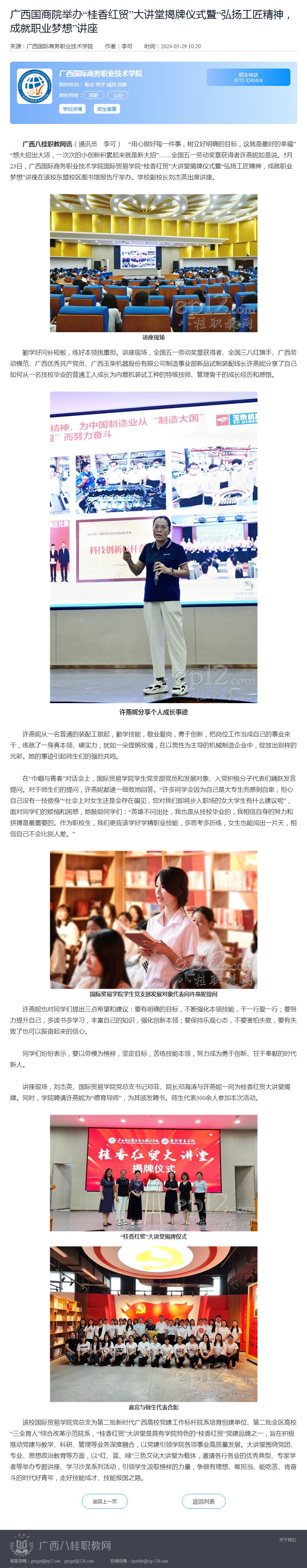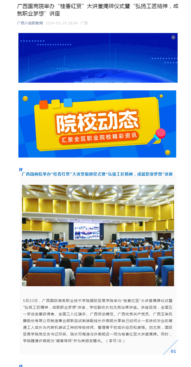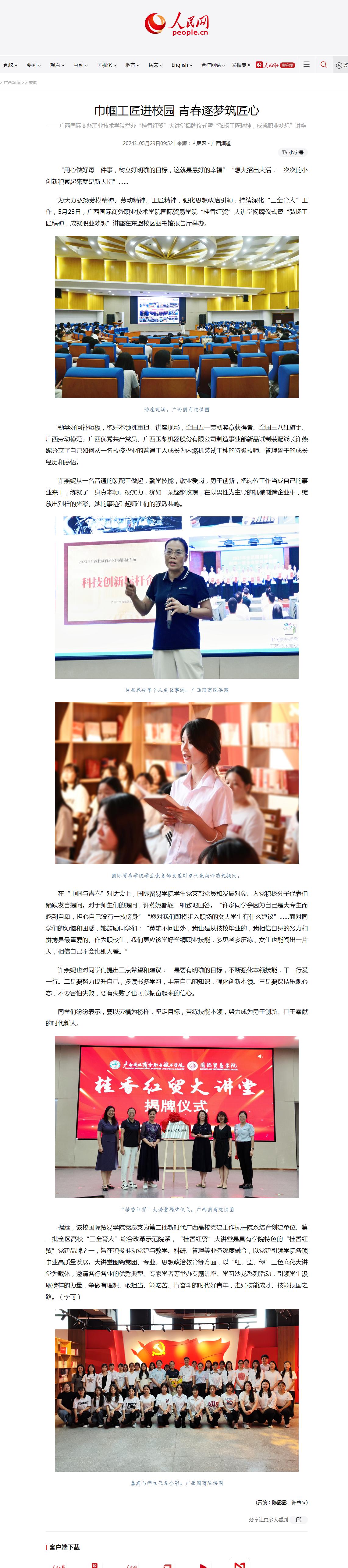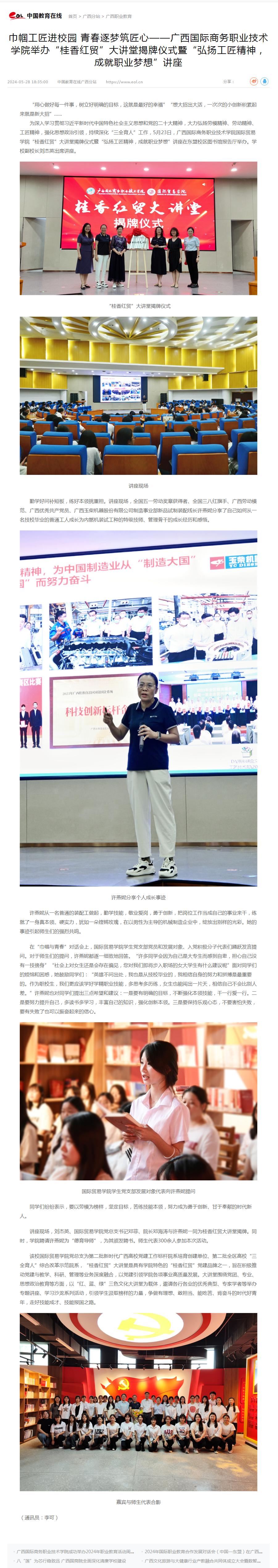 【人民网、广西八桂职教网、广西八桂职教网、中国教育在线】巾帼工匠进校园 青春逐梦筑匠心——广西国际商务职业技术学院举办“桂香红贸”大讲堂揭牌仪式暨“弘扬工匠精神,成就职业梦想”讲座