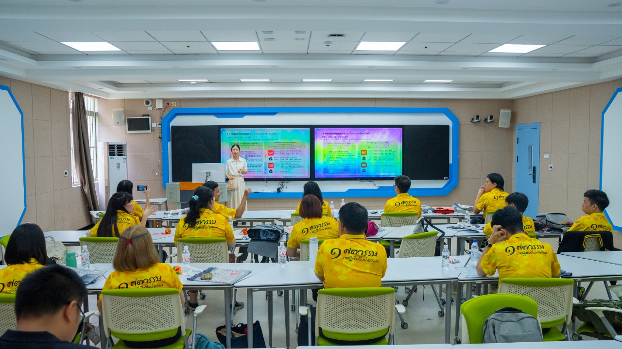 吕欣蓉从电子商务概述与典型跨境电商B2C运营——Shopee两个方面对跨境电商B2C运营进行介绍。近三年,受国内整体消费环境的影响,境内实物商品网上零售额增速有所下降,增量仍在上升,跨境电商的增长速度趋于平缓,总体规模仍逐年增加。Shopee是东南亚领航电商平台,在中国深圳、上海和香港设立跨境业务办公室,吕欣蓉主要讲解并示范了入驻平台、店铺装修及发布产品的运营过程,并展示了学生设计制作的商品主图与直播营销视频,现场教学气氛热烈,泰国清迈皇家大学的教师们对跨境电商的运营表现出了浓厚的兴趣。