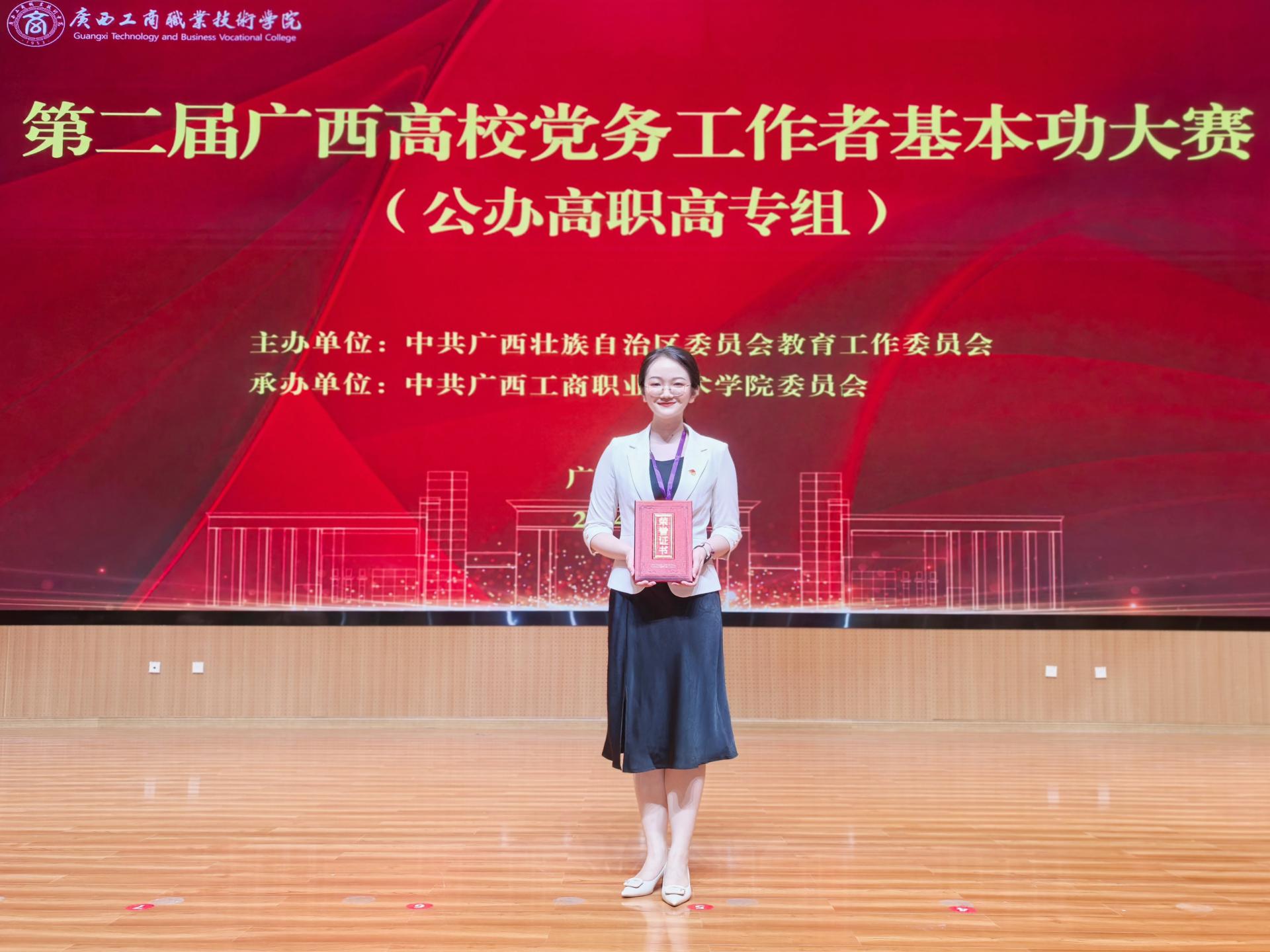 9月19日至20日,由自治区党委教育工委主办、广西工商职业技术学院承办的第二届广西高校党务工作者基本功大赛(公办高职高专组)在广西工商职业技术学院武鸣校区举办,来自全区29所高职高专院校的82名党务工作者同台竞技。经过党务知识测试、微党课、党建工作案例三个环节的激烈角逐,我院选派的袁颖同志获学生党支部书记组一等奖。本次大赛是我院首次组织参赛并获奖,实现了从零到一的突破。