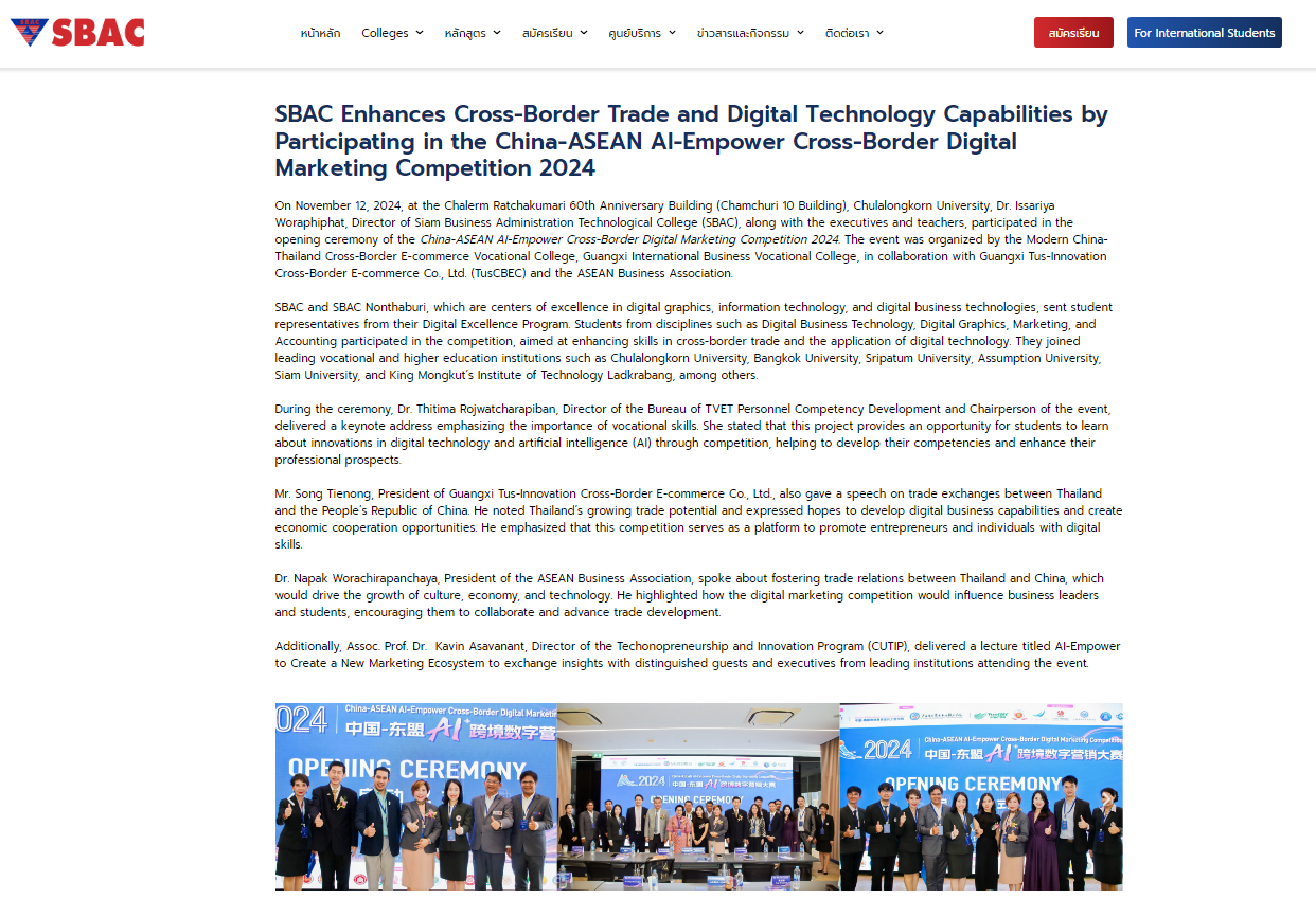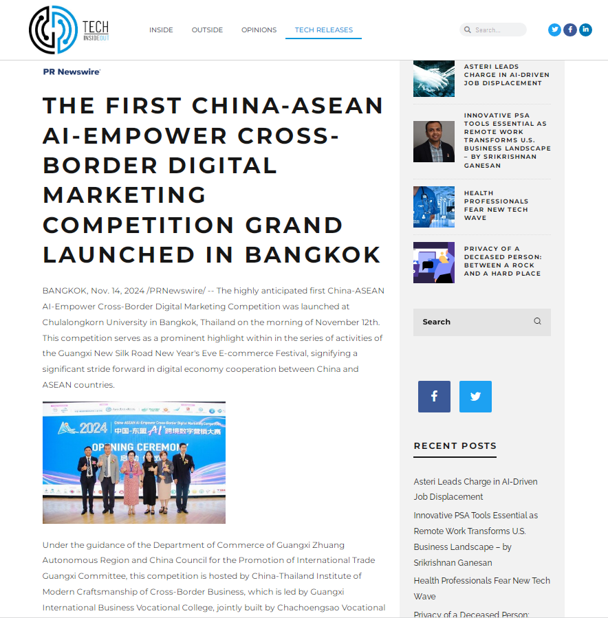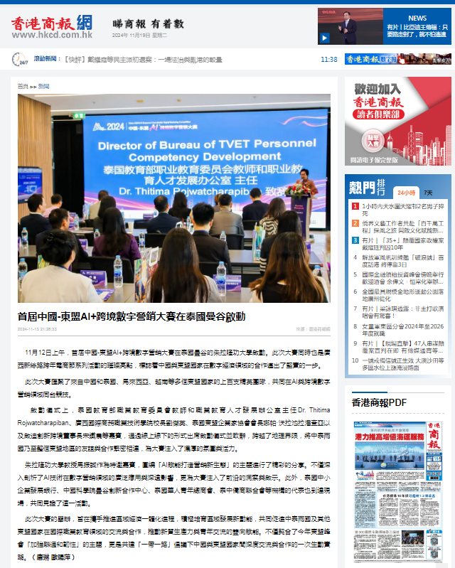 我校宣传稿件《The First China-ASEAN AI-empower Cross-border Digital Marketing Competition Grand Launched in Bangkok》(首届中国—东盟AI+跨境数字营销大赛在曼谷盛大启动)在大洋洲地区、亚太地区两个国家以及中国香港、澳门特别行政区,以三种语言同步发布,引发广泛关注。该稿件不仅成功登陆了当地主流媒体、门户网站及重点资讯网站,还被广泛转载落地,总量高达8家次,充分展现了我校的国际影响力。