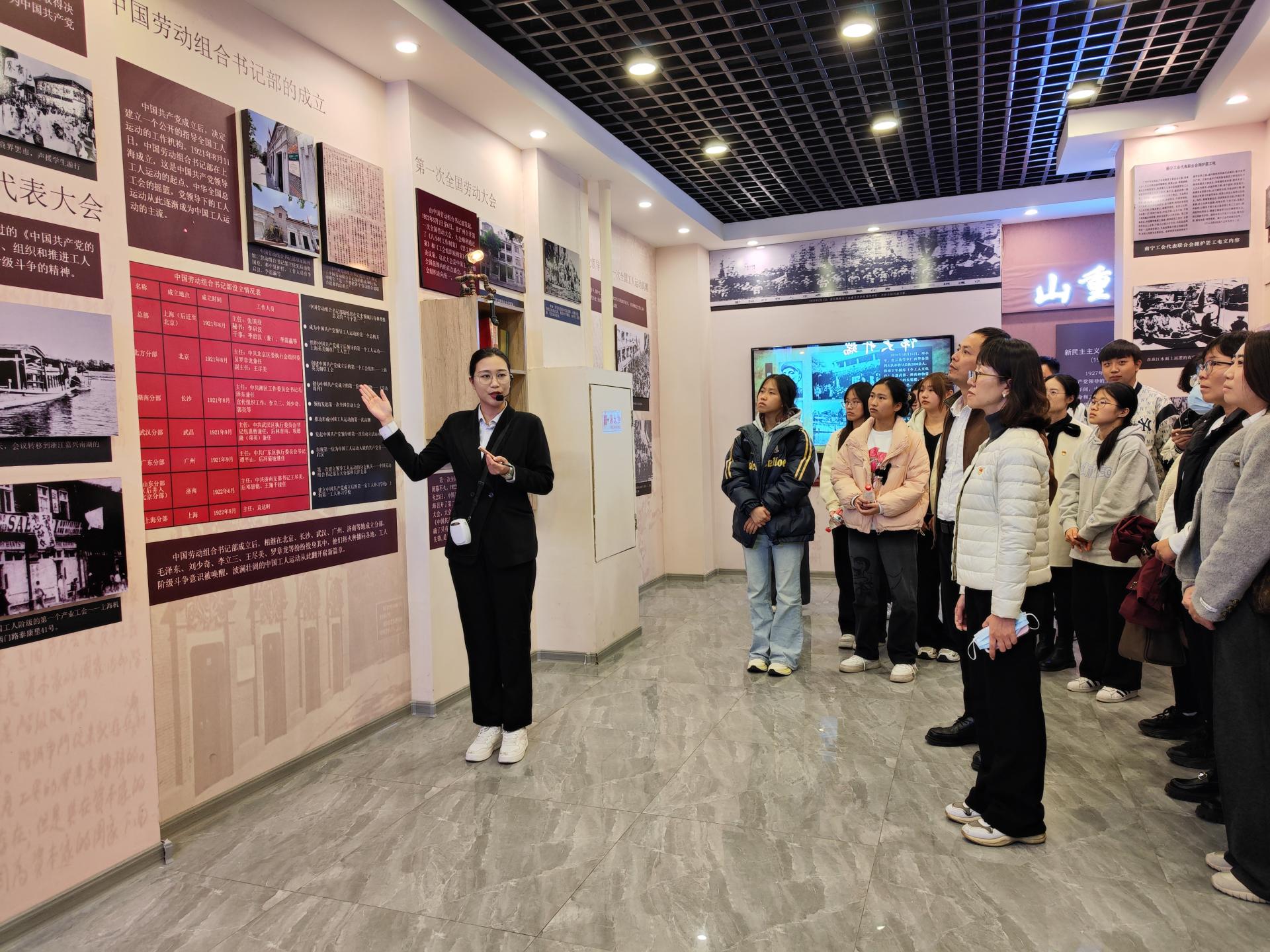 师生们在讲解员的带领下走进红色工运史陈列展馆,展陈区分为“伟大开端”、“山重水复”、“抗日烽火”和“天翻地覆”四个篇章,通过文字、图片、视频等多种媒介,生动展现了1919年至1949年中共党史和中国工运史交汇的重要历史事件。让大家深刻感悟了中共党史、工运史的奋斗历程和工人阶级的革命精神。