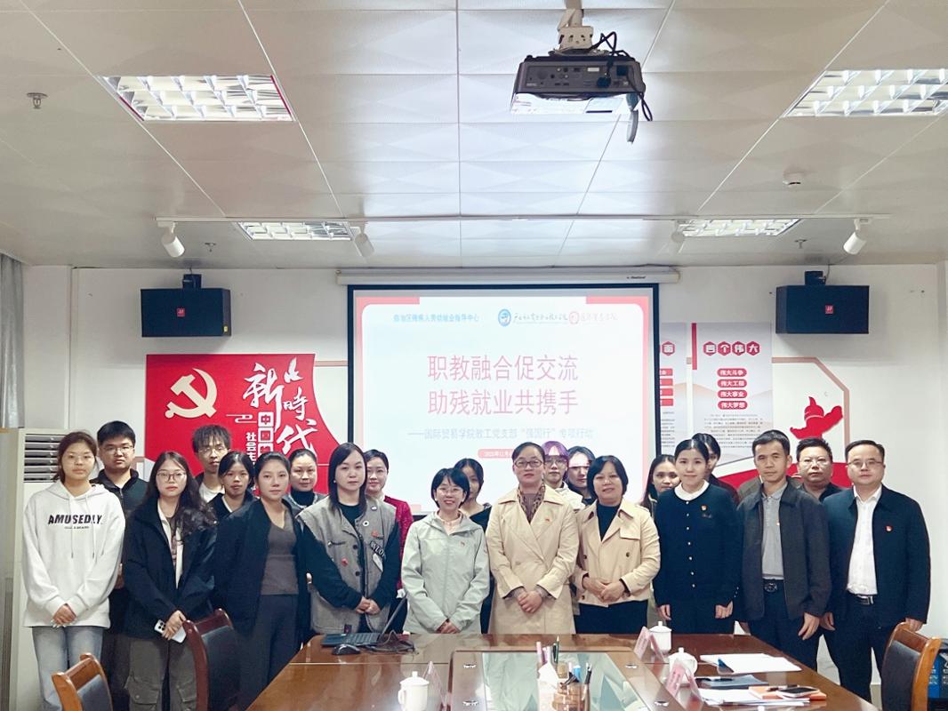 为深化职业教育与助残就业工作融合,推动党建与业务协同发展,2025年11月4日下午,我院教工党支部与自治区残疾人劳动就业指导中心党支部在广西残疾人事业园联合开展“职教融合促交流,助残就业共携手”联建共建活动。自治区残联教就部负责人韦敬、自治区残疾人劳动就业指导中心主任兼党支部书记韦波、国际贸易学院教工党支部纪检委员廖源、学生党支部“小红贸”志愿服务队及学院党建协同育人单位广西瑞宝麒教育科技有限公司副总经理吴薇共20余人参加。
