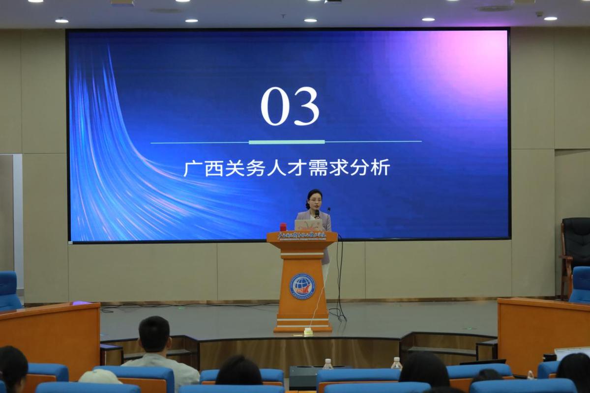 为深化关务与外贸服务专业建设,推动产教融合,2025年11月14日技能进阶周期间,国际贸易学院特邀广西报关协会会长杨玉芳,在我校东盟校区图书馆学术报告厅带来“关务新趋势与外贸人才职业发展”专题讲座。国际贸易学院党总支专职副书记杨明、广西报关协会行业/培训部主任谢斯与200余名师生共同聆听了讲座。