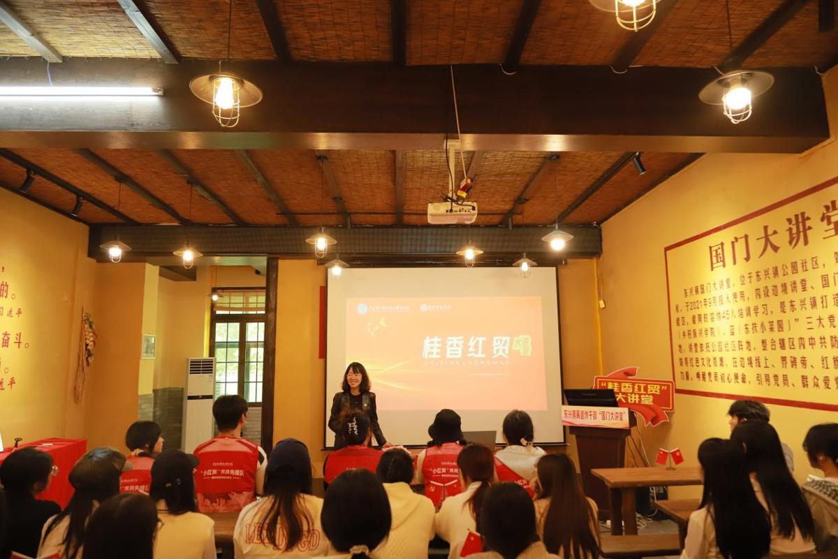 “桂香红贸”大讲堂现场,国际贸易学院党总支书记邓菲为师生带来专题分享。结合东兴作为边境口岸城市的特殊区位,邓菲从基层党组织建设、边境防控责任、民族团结进步等方面,分享党员干部扎根边疆、服务群众的鲜活故事,重点阐述“桂香红贸”党建品牌以党建为魂、专业为基、服务区域为要的育人内涵,强调专业人才在边境贸易、跨境服务、文化交流等领域的重要价值,鼓励师生将专业所学与国家需求、地方发展紧密结合,树立“扎根边疆、服务社会”的理想信念。现场师生认真聆听、积极互动,在思想碰撞中深化对党建引领地方发展的认识,进一步明确青年一代的责任与使命。