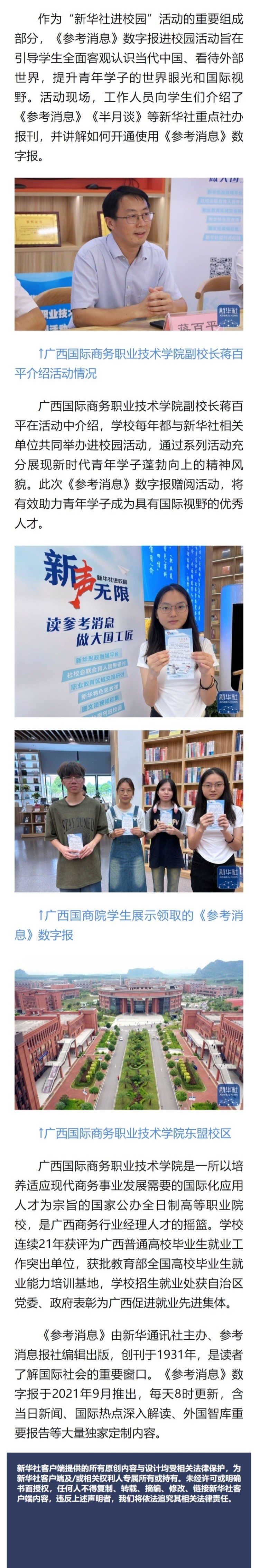 【新华社】“新华社进校园”活动走进广西国商院 《参考消息》数字报赠阅新生