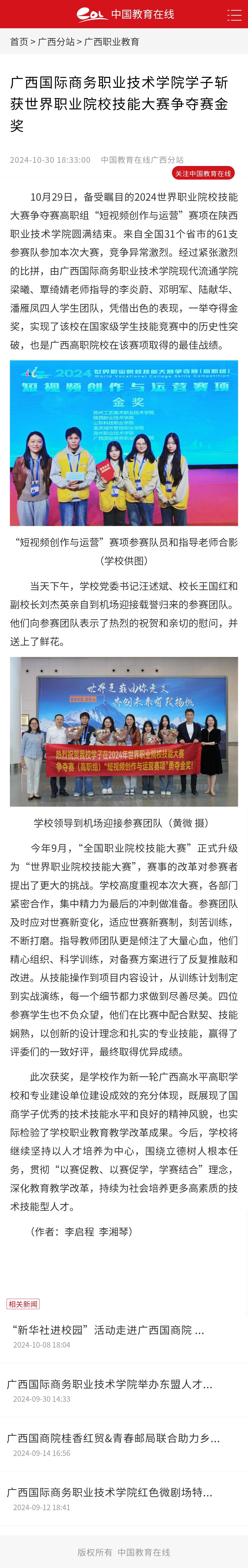 【中国教育在线】广西国际商务职业技术学院学子斩获世界职业院校技能大赛争夺赛金奖