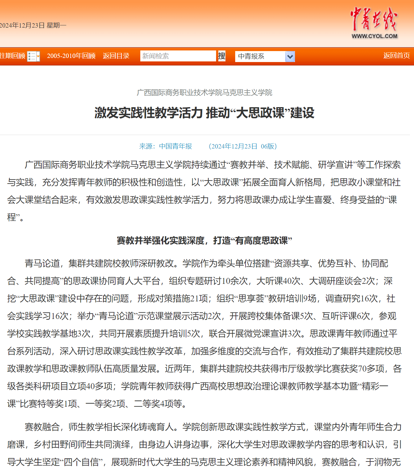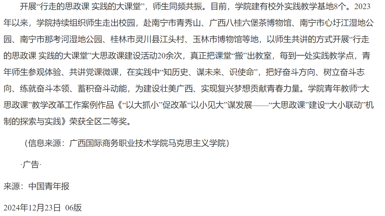【中国青年报】广西国际商务职业技术学院马克思主义学院激发实践性教学活力 推动“大思政课”建设