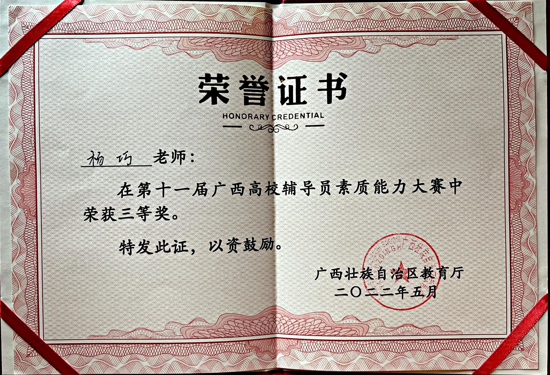 5月12至14日,由自治区教育厅主办,教育部高校思想政治工作队伍培训研修中心(广西师范大学)承办的第十一届广西高校辅导员素质能力大赛在桂林举办,共有来自全区各高校的84名专职辅导员参赛。经过为期三天的激烈角逐,我校选派的应用外国语学院辅导员杨巧荣获大赛三等奖。