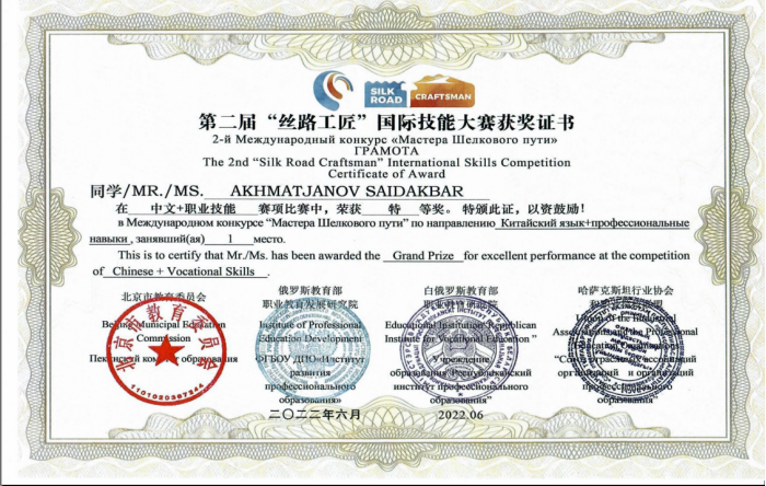 为进一步服务“一带一路”倡议,促进与“一带一路”沿线国家教育合作、人文交流,6月23-28日,由北京市教育委员会、俄罗斯教育部职业教育发展研究院、白俄罗斯教育部职业教育研究院、哈萨克斯坦教育部工业联盟和职业教育学会共同主办了第二届“丝路工匠”国际技能大赛,我校选派3名留学生参加该项比赛。