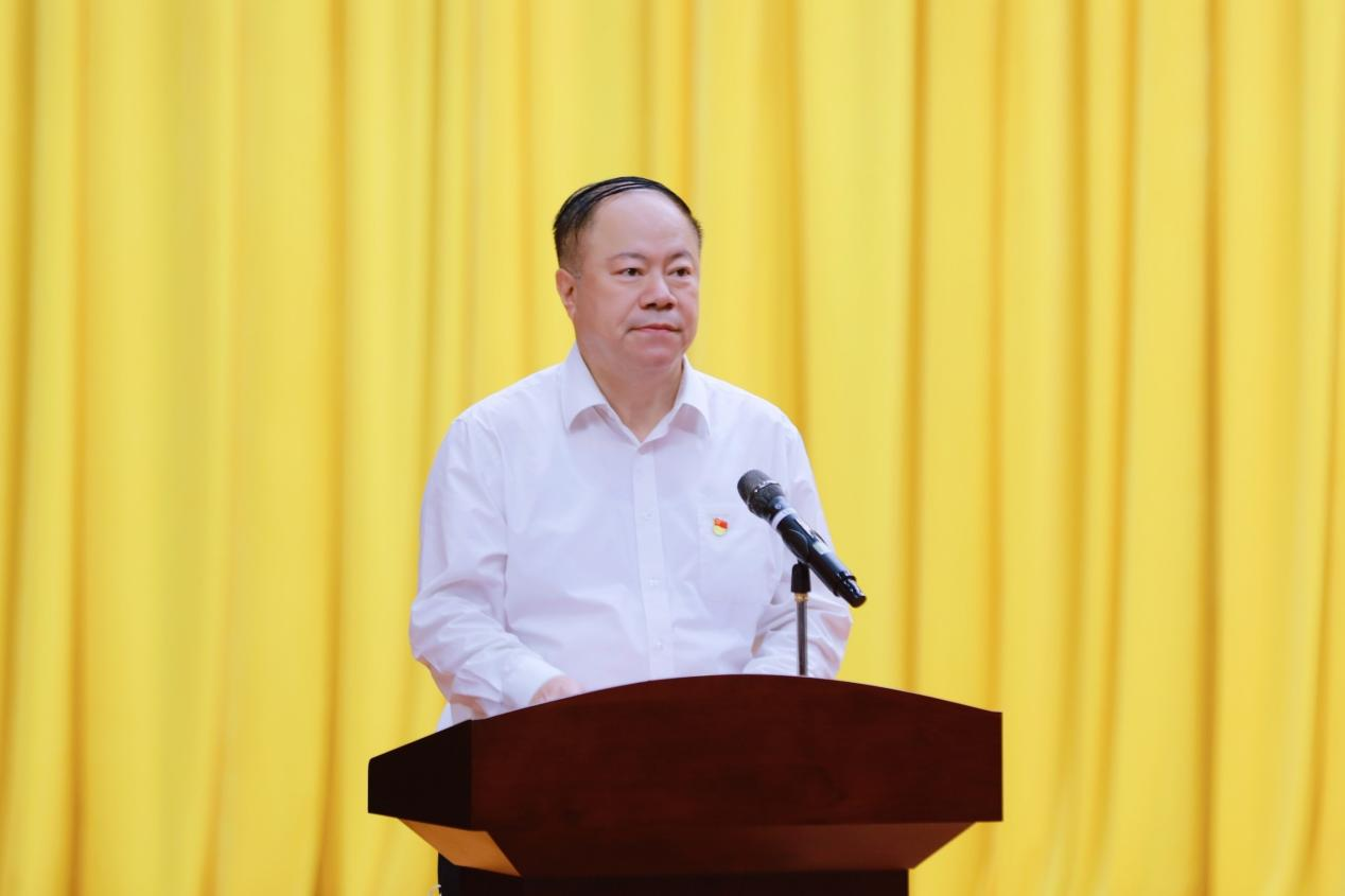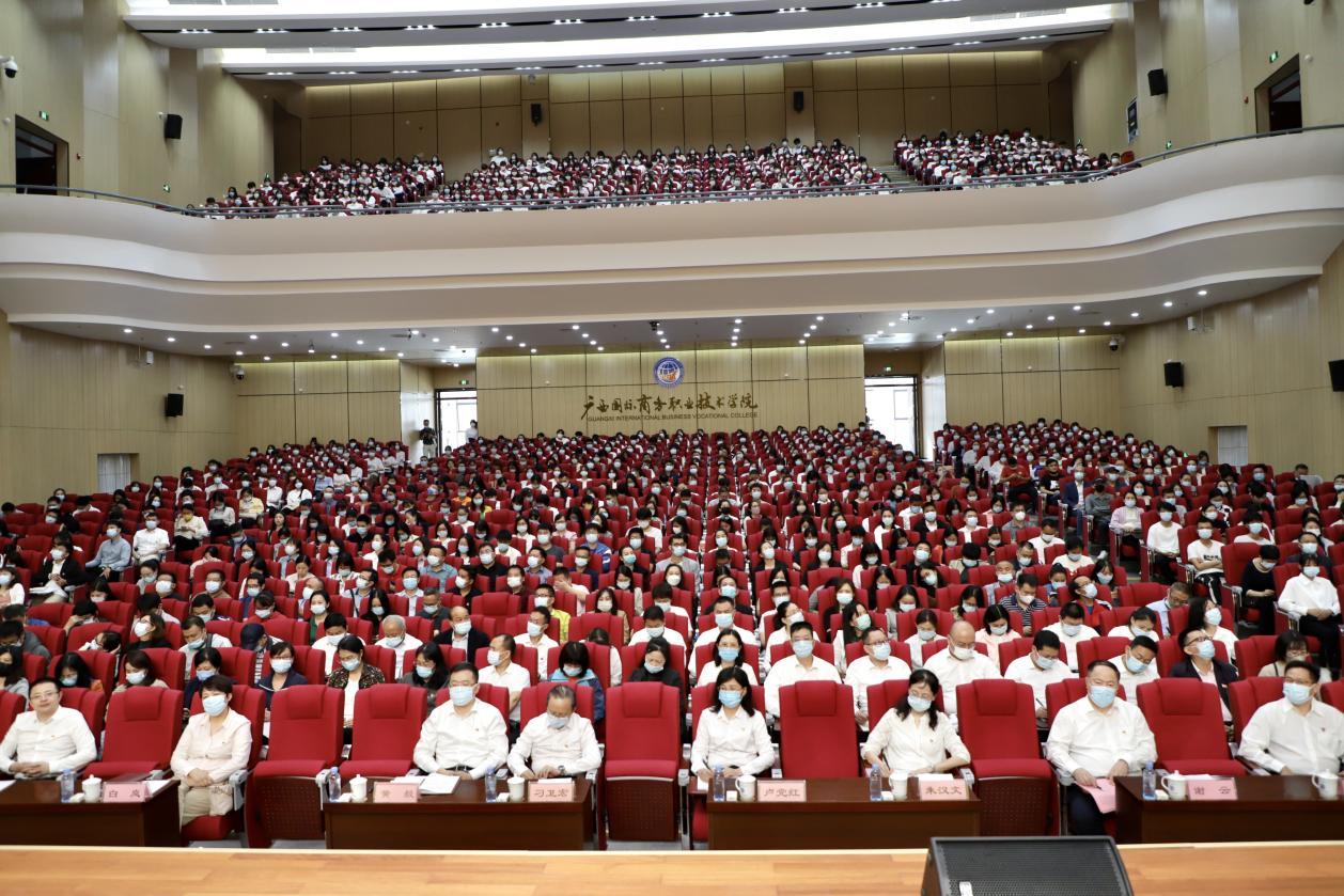 11月11日上午,学习贯彻党的二十大精神自治区宣讲团宣讲报告会在广西国际商务职业技术学院东盟校区召开。自治区宣讲团成员,自治区商务厅党组书记、厅长杨春庭以《听党话,跟党走,紧跟伟大复兴领航人,用青春谱写中国式现代化广西篇章的华章》为题做了一场生动的宣讲报告,同时也为广大师生带来了一堂精彩的思政课。自治区商务厅领导班子、二级巡视员,各处室主要负责人,学校全体校领导、中层干部、副高以上职称教职工、全体教职工党员、离退休党员代表及学生党员、入党积极分子代表约990人参加报告会。报告会由学校党委书记谢云主持。
