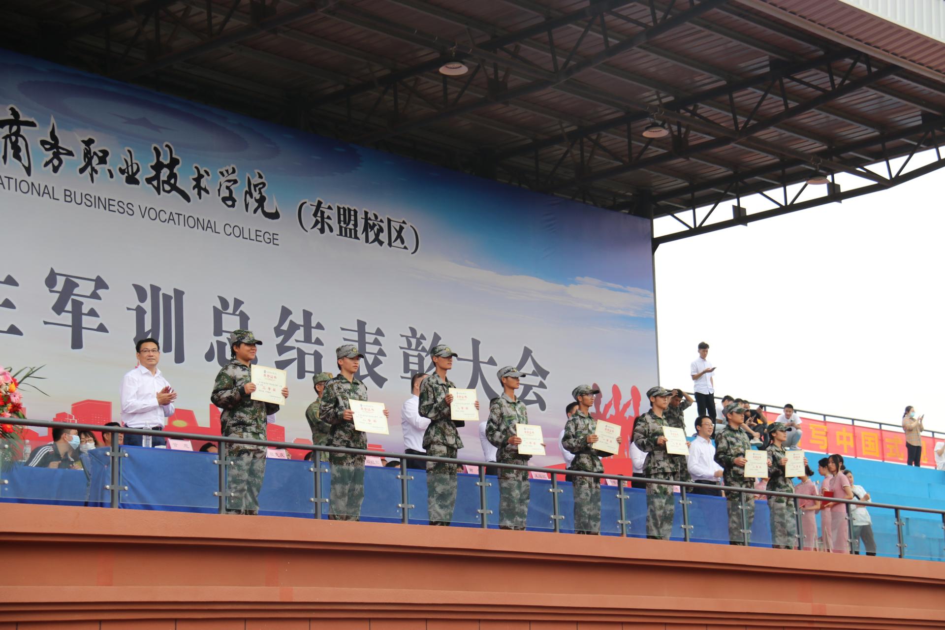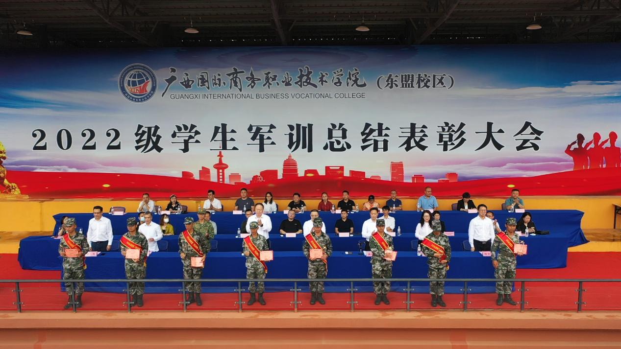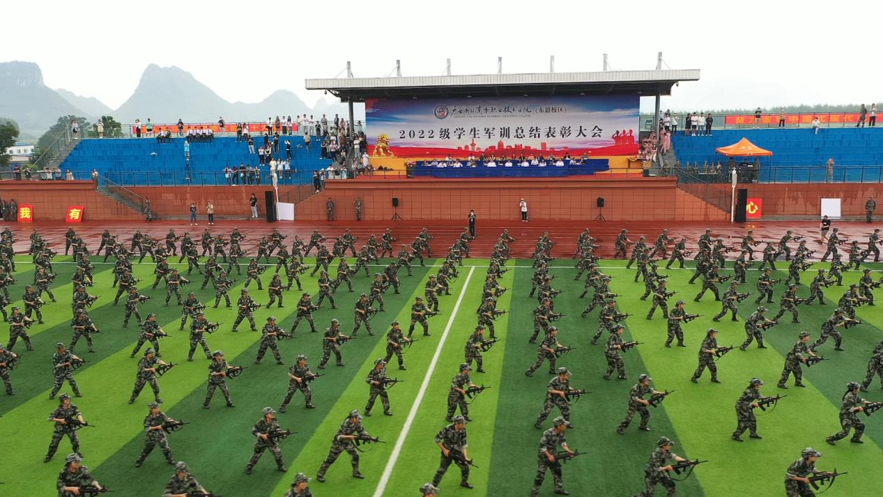 在催人振奋的嘹亮军歌声中,2022级新生军训总结表彰大会圆满结束。学校各相关职能部门负责人、二级学院主要领导和东盟校区2022级新生参加当天的总结表彰大会。