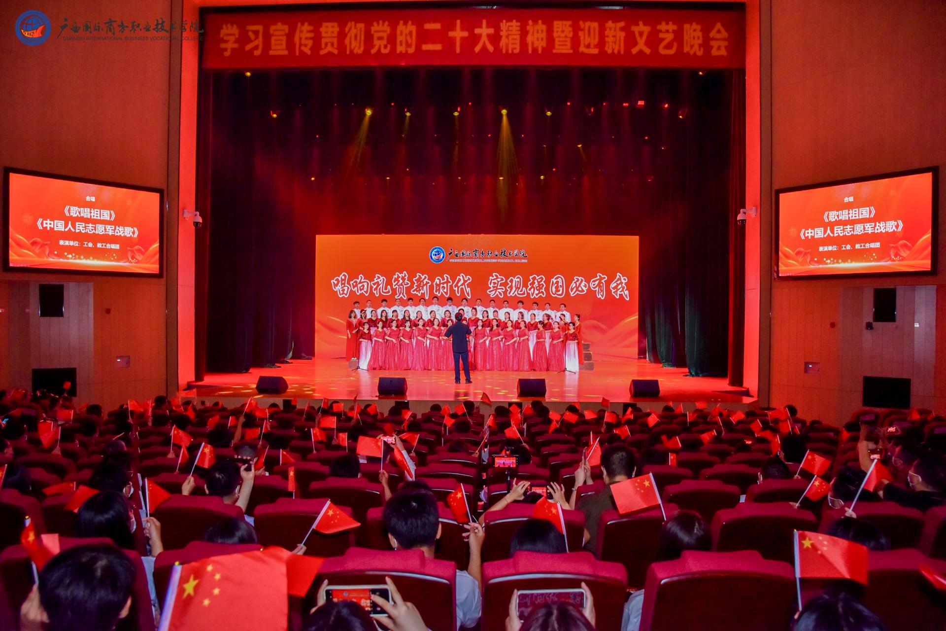 11月14日,我校在东盟校区聚学堂举办学习宣传贯彻党的二十大精神暨迎新文艺晚会。学校党委书记谢云,党委副书记、校长王国红,党委副书记青增计,副校长班克庆,副校长刘杰英,纪委书记甘忠、副校长蒋百平与近千名师生代表共同观看了晚会。