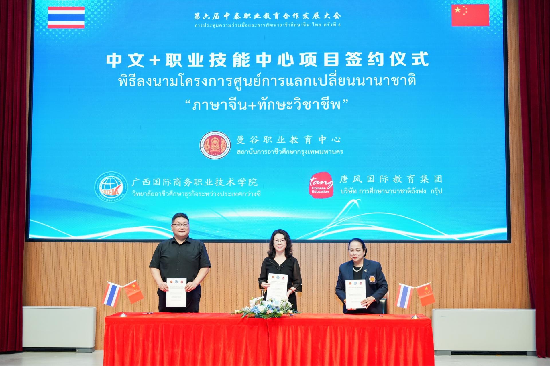 会上,副校长刘杰英代表学校与曼谷职业教育中心签署了中文+职业技能中心合作协议。未来,学校将在曼谷中心下属院校建立海外中文+职业技能培训基地,开展多种形式的职业教育合作。