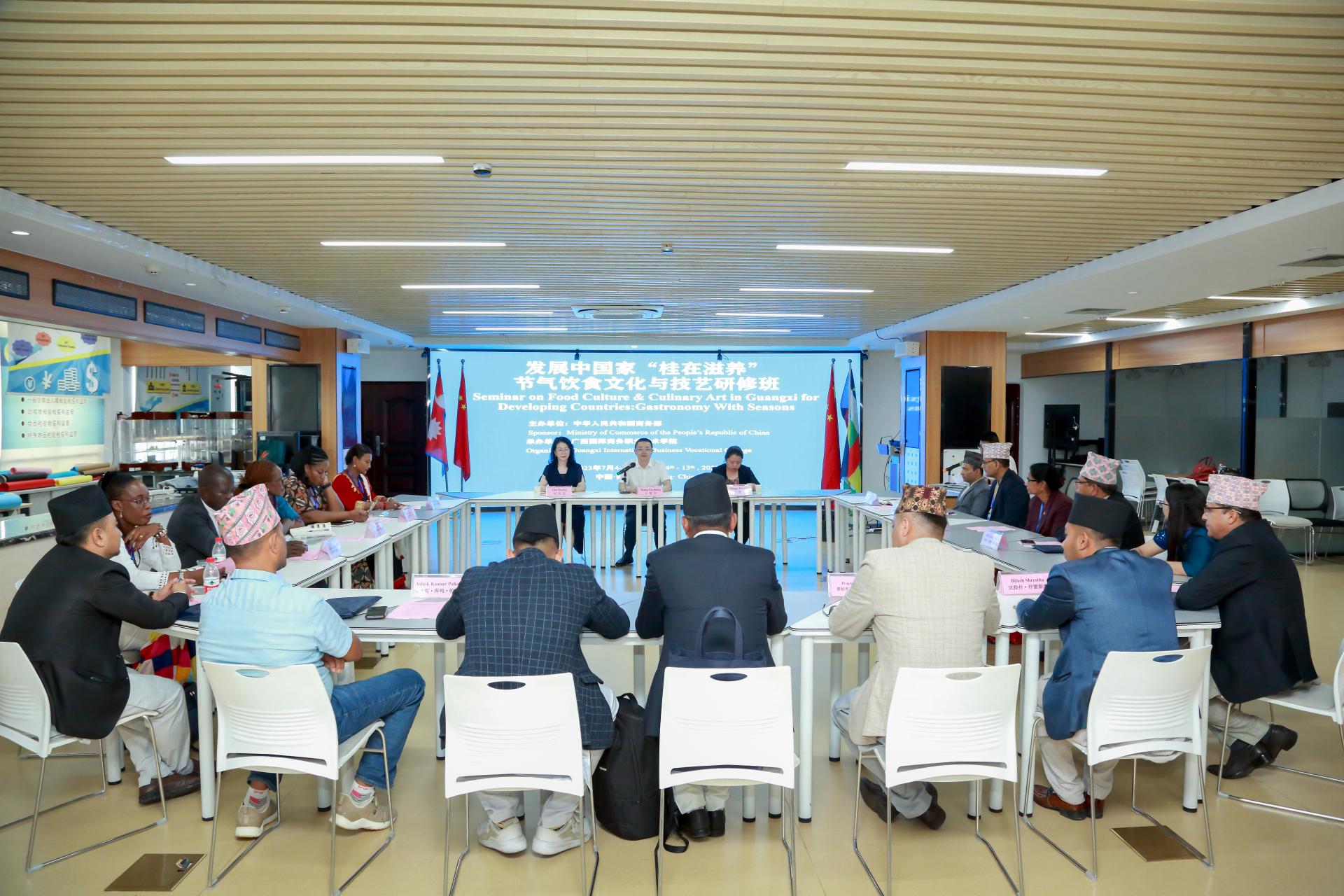 7月5日下午,由商务部主办、我校承办的“发展中国家‘桂在滋养’节气饮食文化与技艺研修班”开班仪式在我校举行,17位来自中非共和国和尼泊尔的学员参加了开班仪式。仪式由副校长刘杰英主持,自治区商务厅对外经济合作处二级调研员张建英和我校校长王国红出席仪式并致辞,来自尼泊尔的阿妮塔·马哈詹女士代表研修班学员发言。