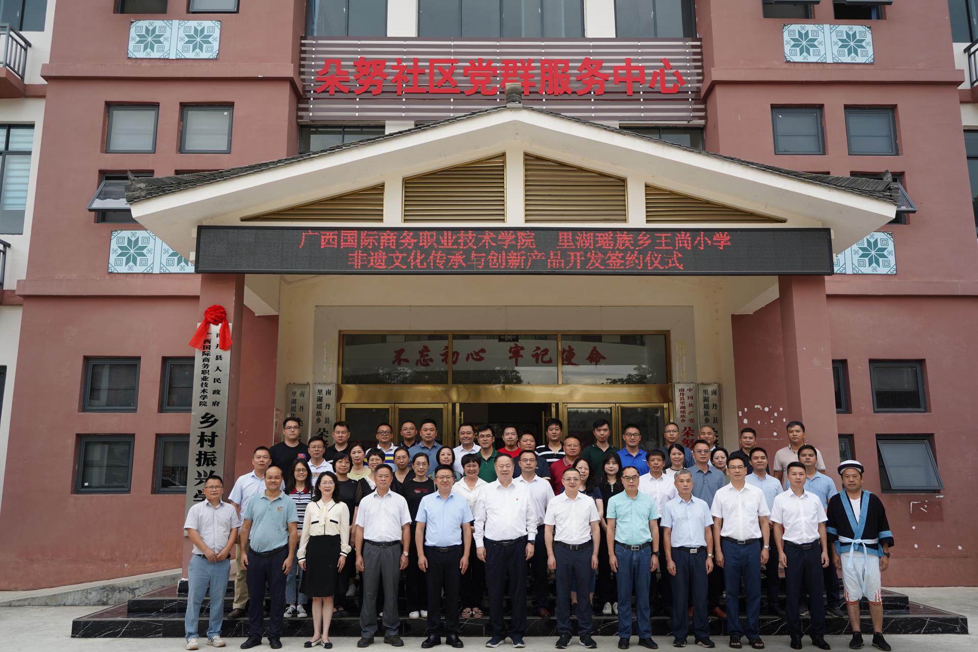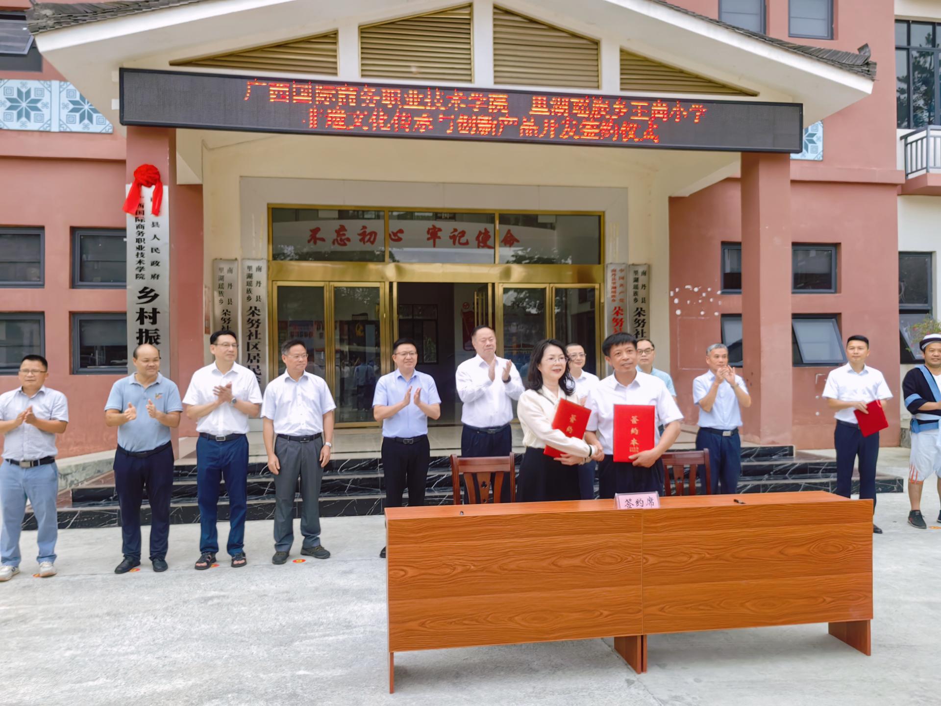 揭牌仪式上,在双方领导的见证下,刘杰英和南丹县王尚小学校长覃玉先就共同开展非遗文化传承和产品、课程开发等方面的合作签署合作协议。