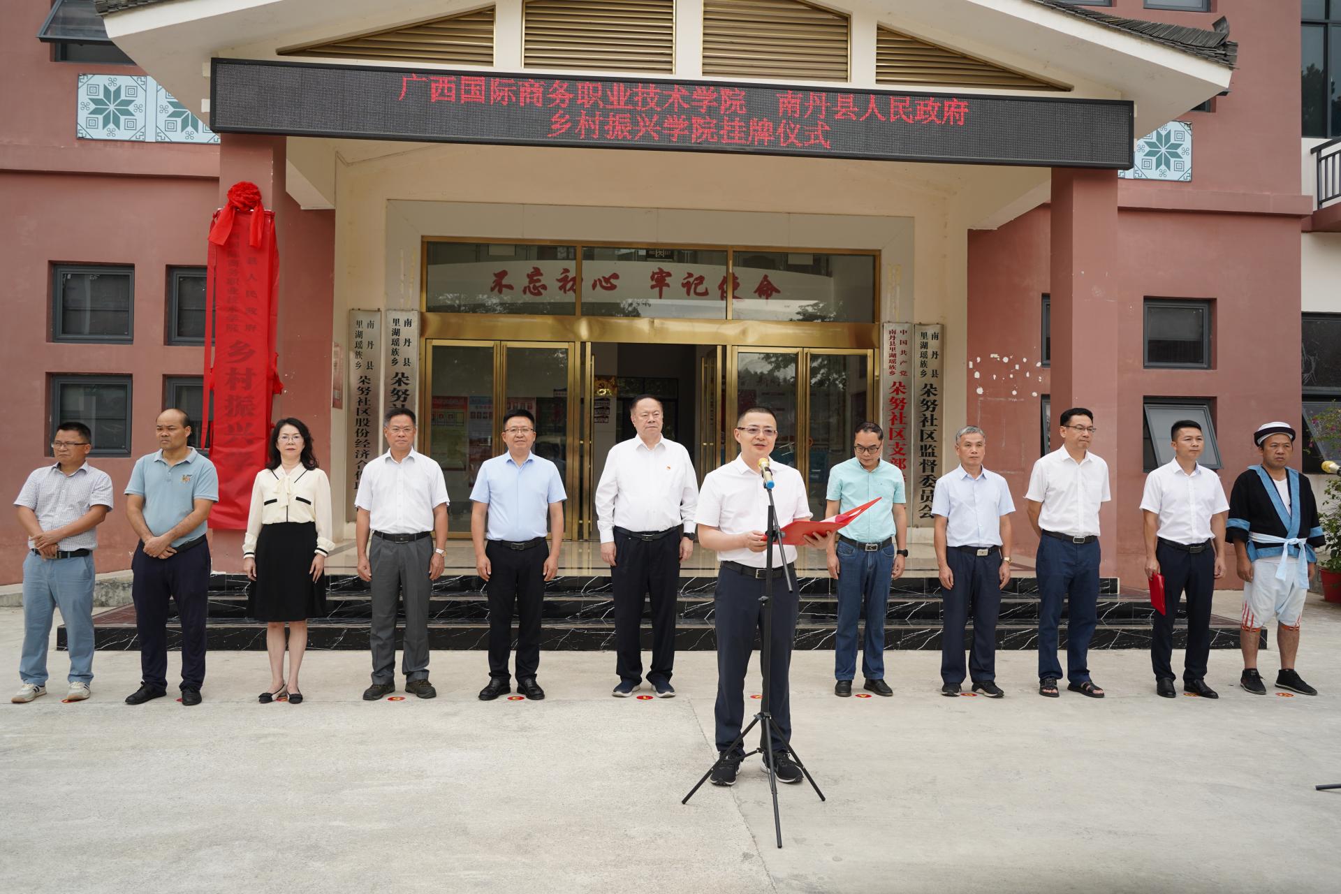 王国红在致辞中对南丹县各级党委和政府为我校驻村干部提供的指导和帮助表示衷心的感谢,并指出成立乡村振兴学院是我校贯彻落实党的二十大精神,助推我校与南丹县高质量发展的具体举措和生动实践。他表示,乡村振兴学院将围绕南丹县急、难人才需求,结合学校专业技术优势,以政府和事业单位人员管理能力提升、南丹县龙头企业人才培训、非遗文化传承和产品开发、打造乡村振兴终生教育基地为重点开展工作,通过乡村振兴学院的人才振兴带动作用,持续巩固拓展脱贫攻坚成果,与南丹县共谱校地合作佳话。