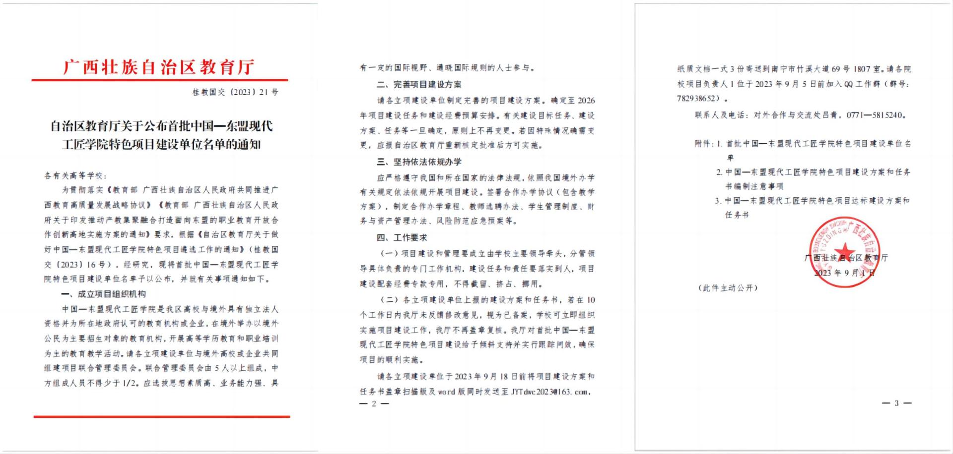 9月1日,自治区教育厅公布首批中国—东盟现代工匠学院特色项目建设单位名单,我校“中国—泰国跨境商务现代工匠学院”项目入选为自治区首批“中国—东盟现代工匠学院特色项目”。