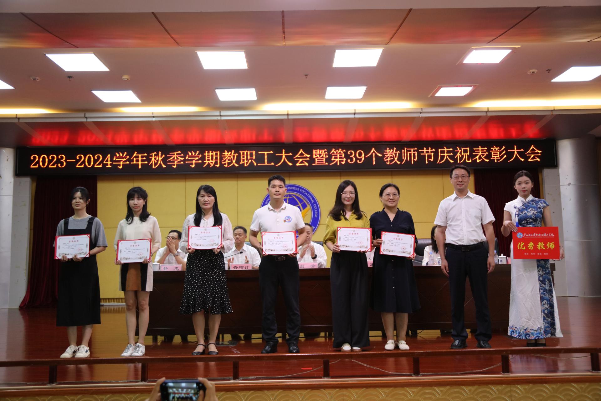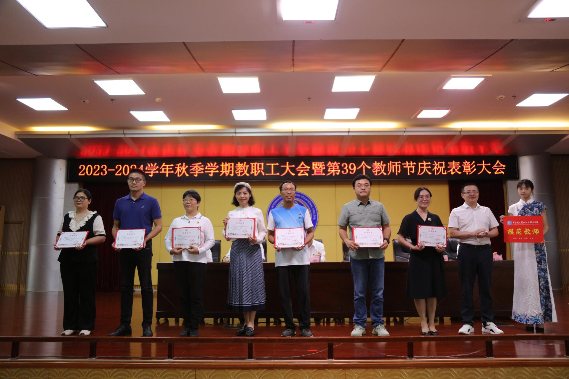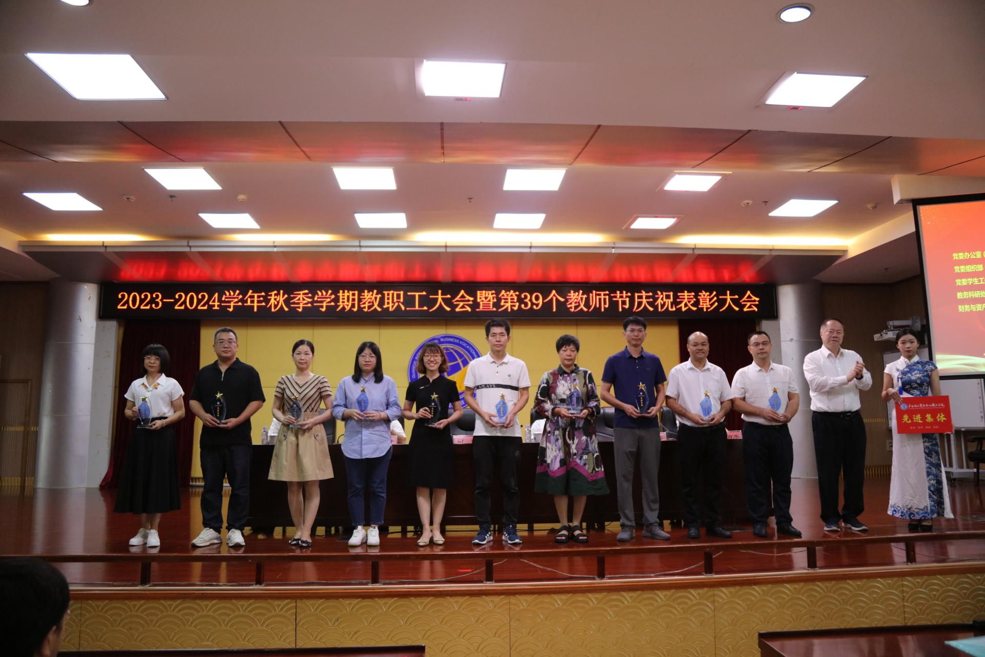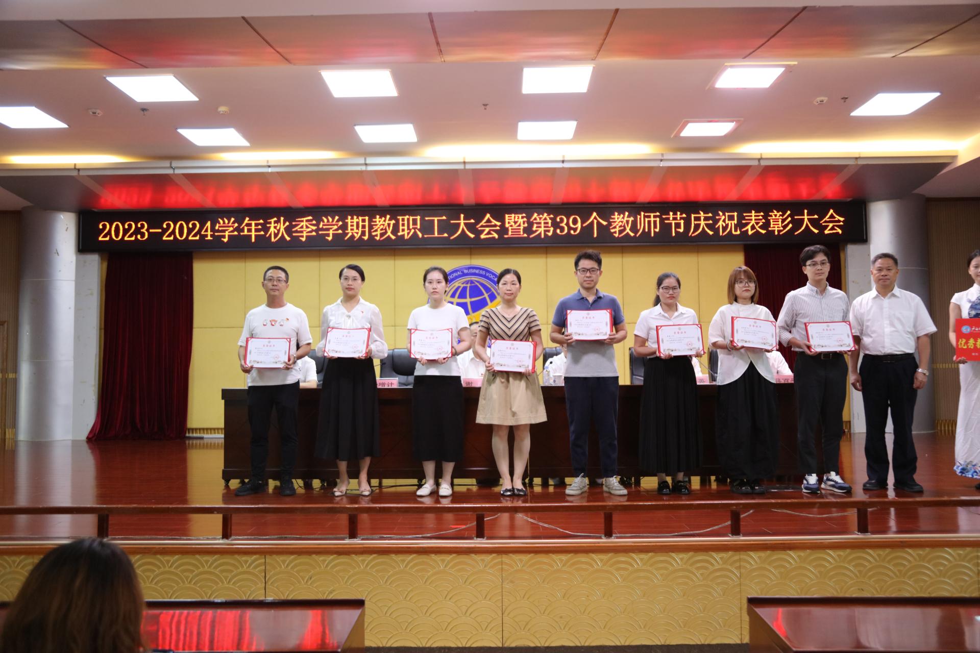 会上,青增计宣读了我校《关于2022年度激励干部担当作为专项奖励表彰的决定》和《关于表彰2022-2023学年教师节先进集体和先进个人的决定》,学校领导依次为受表彰的先进集体及先进个人颁发奖杯和证书。