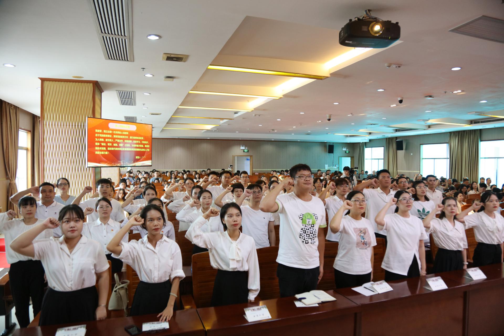 会议在雄壮的国歌声中拉开序幕,全体新入职教师举起右手对党和人民的教育事业进行了庄严宣誓,立志做一名光荣的人民教师,忠于党的教育事业,贯彻党的教育方针,履行教师神圣职责。