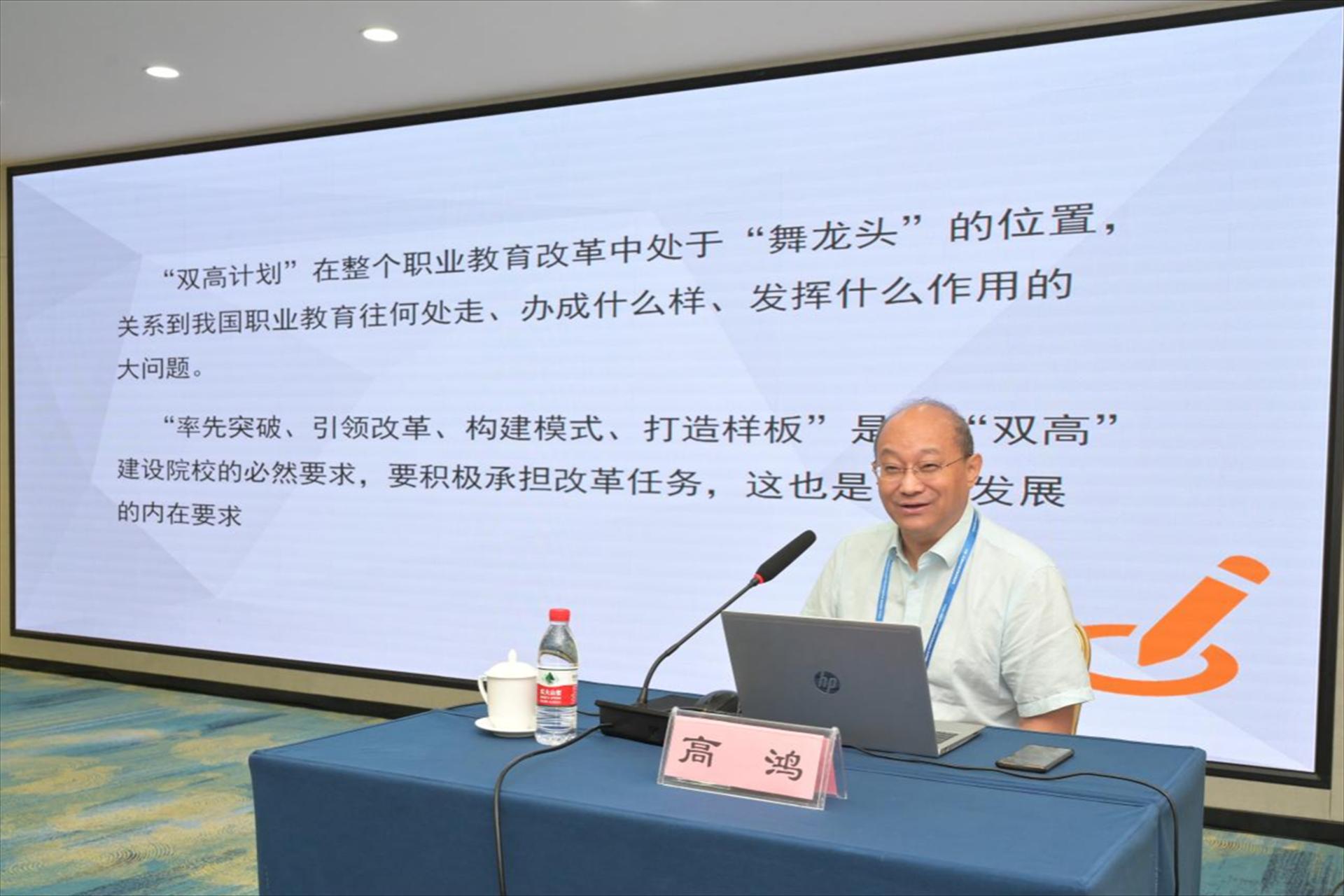 高鸿作了主题为《推进“双高建设”全面升级与转型的思考》的报告。他围绕“双高计划”建设取得的显著成效和存在问题进行了详细解析,分析了职业教育未来前景和政策大趋势,为接下来的“双高计划”建设的深化、升级与转型明晰了方向,强调了新时代“双高”校的使命与担当。